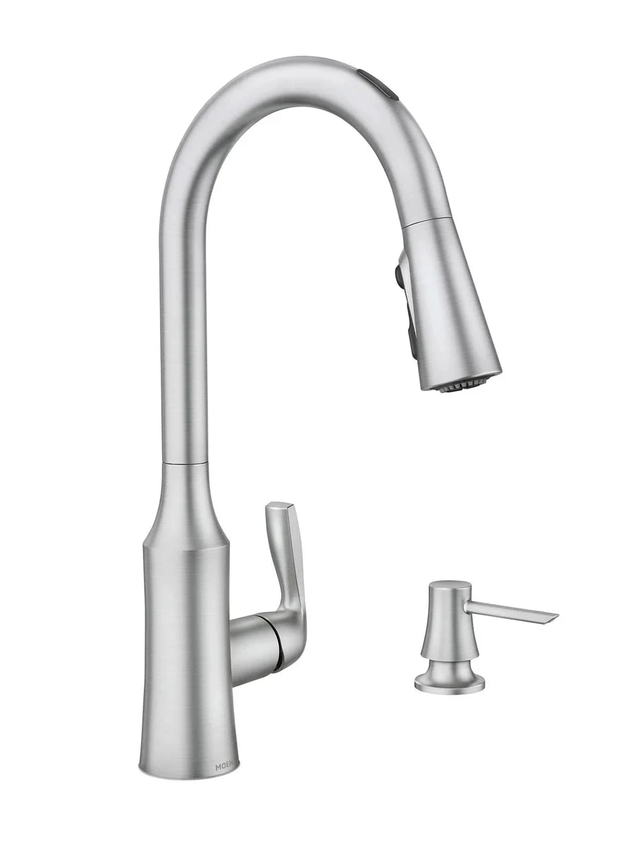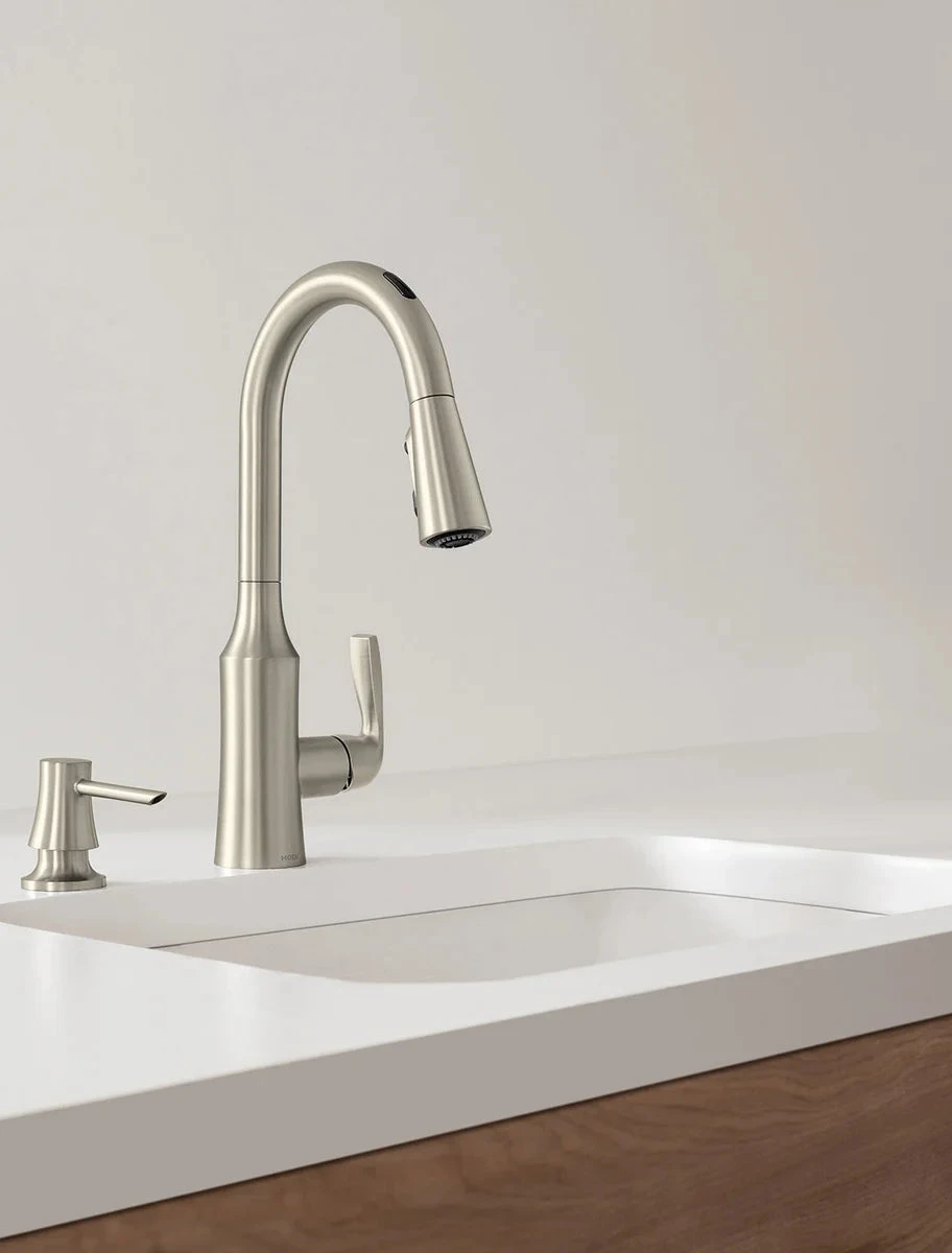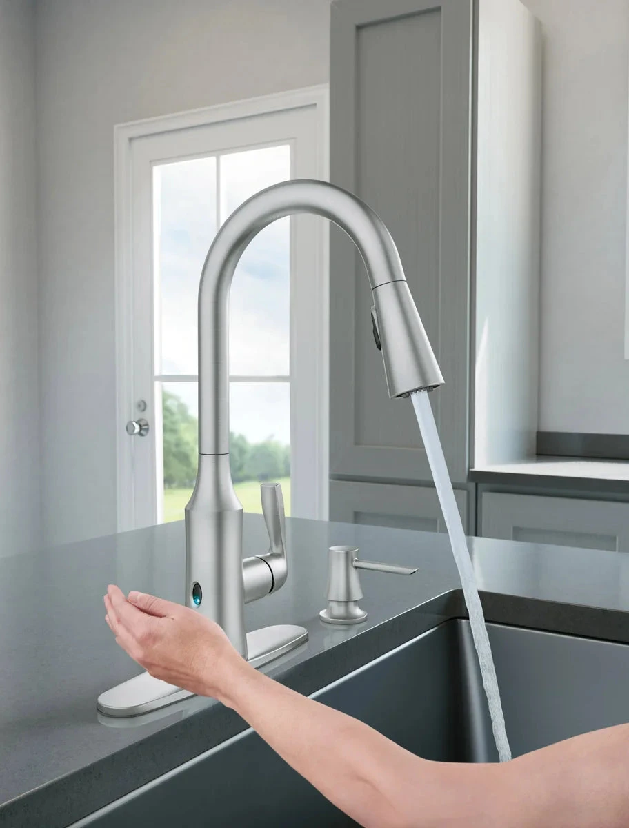 The Cadia™ pulldown kitchen faucet with MotionSense Wave™ touchless technology offers a sleek, contemporary design combined with the convenience of truly hands-free activation. The fixture features Moen’s Power Clean™ spray technology, which cleans 50 percent faster than Moen faucets without the technology, as well as the Reflex® system to ensure smooth operation and secure docking of the spray wand. Cadia kitchen faucets mount with or without a deck plate and come with a matching soap dispenser for added convenience. Available in Moen’s exclusive Spot Resist™ Stainless finish, which resists fingerprints and water spots to maintain the fixture’s brilliance and minimize cleaning time.