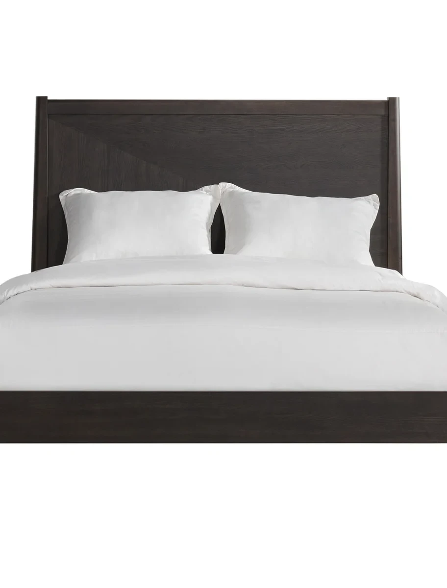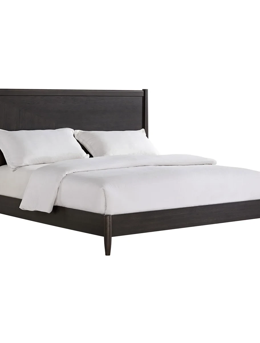 The Monroe Bay Bed features a modern silhouette, accentuated by clean lines, tapered feet and a dark charcoal gray finish. It’s constructed of Alder solids and Oak veneers with engineered wood. The slat and deckboard foundation eliminate the need for a box spring. The panel style headboard with extended posts and round, tapered legs further adds to the mid-century modern style. This unique combination will add the perfect blend of simple sophistication and warmth to your bedroom.