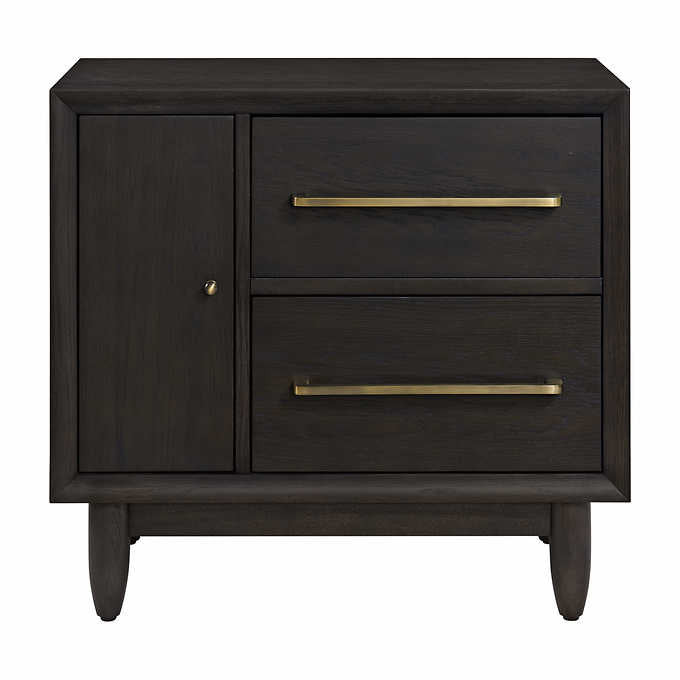 The Monroe bay nightstand features clean lines, tapered legs and a dark charcoal gray finish. It's constructed of a solid poplar frame, oak veneers with engineered wood. Striking brass drawer pulls finish off the look with a modern, distinguished style. The drawers feature Blum premium soft-close glides and mechanism. This unique combination will add the perfect blend of simple sophistication and warmth to your bedroom.