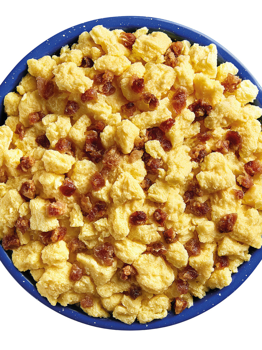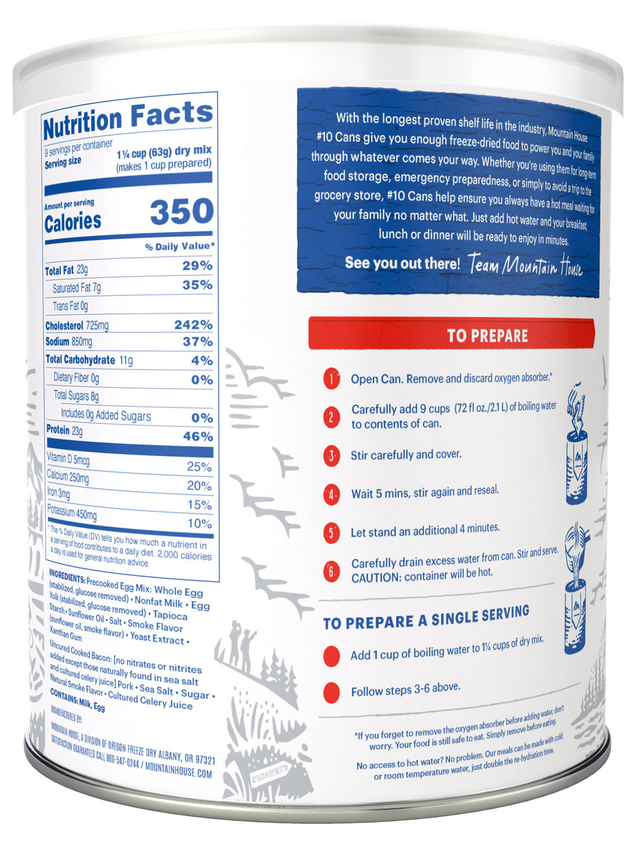 Preparing this tasty breakfast is a breeze – just add hot water, and within minutes, you'll have a delicious meal ready to enjoy. Whether you're in the great outdoors or simply seeking a convenient and hassle-free breakfast at home, Mountain House Scrambled Eggs with Bacon is the perfect choice.