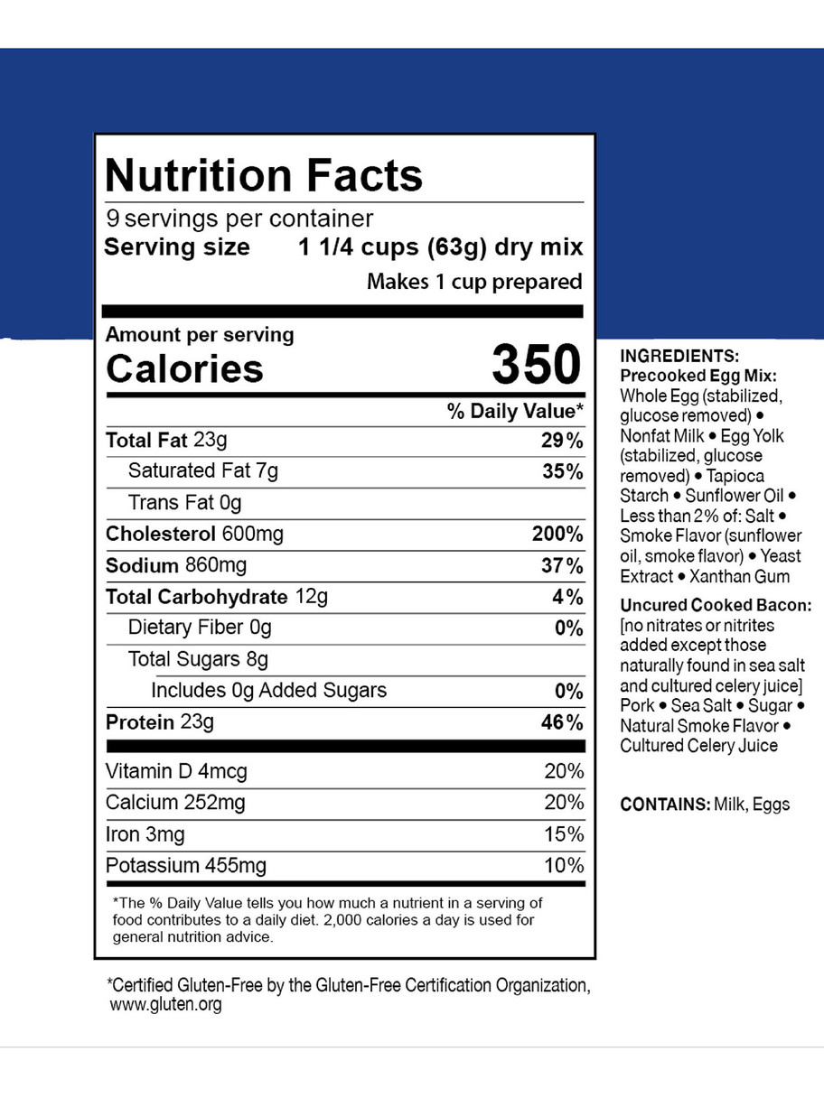 Indulge in the perfect breakfast with Mountain House Scrambled Eggs with Bacon – a delectable combination of scrambled eggs and smoked bacon that's sure to satisfy your taste buds. Each can provides nine servings, making it ideal for sharing with the whole group during family camping trips or emergencies (even if that emergency is that Mom needs a break from cooking an elaborate breakfast this morning). Certified gluten-free by GFCO and free from artificial preservatives, flavors, or colors, this meal ensures a wholesome and flavorful start to your day.
