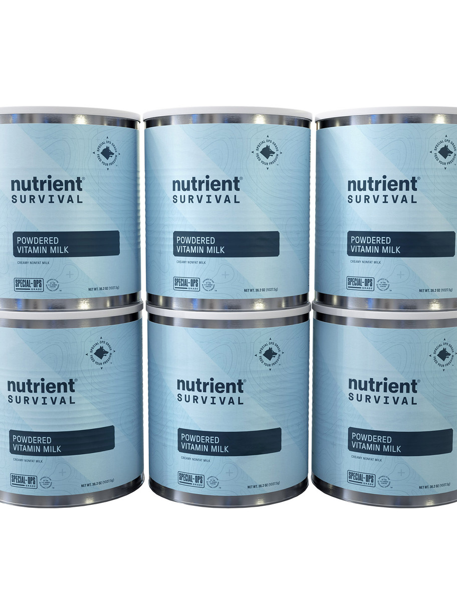 Vitamin Milk makes normal milk blush. That’s because it’s packed with 21 essential nutrients - 13 vitamins, 7 minerals, and 6g protein per serving. Enjoy this creamy non-fat milk warm or cold, knowing you’re giving your body the nutrients it needs to thrive. Bessie would be proud! Packed in an easy-to-store case containing six #10 cans with resealable lids for a total of 360 servings, equivalent to 360 cups or 22 ½ gallons. Just add water, ready in minutes. No artificial flavors, colors or preservatives. Gluten free. Soy free.