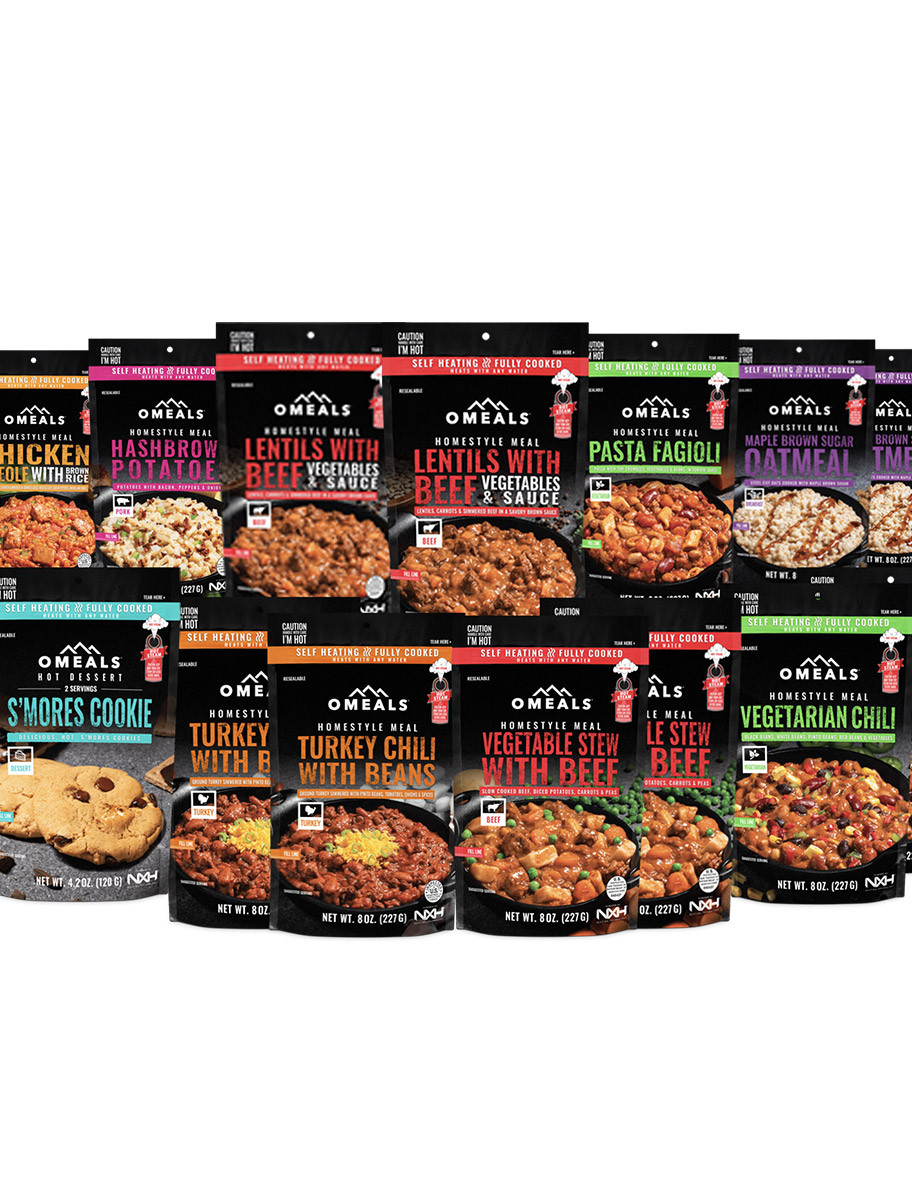 OMEALS premium Ready-to-eat meals are the only self-heating, fully cooked, ready in minutes meals on the market. Just add a 3-5 ounces of any non-flammable liquid and you’re ready to eat in minutes.