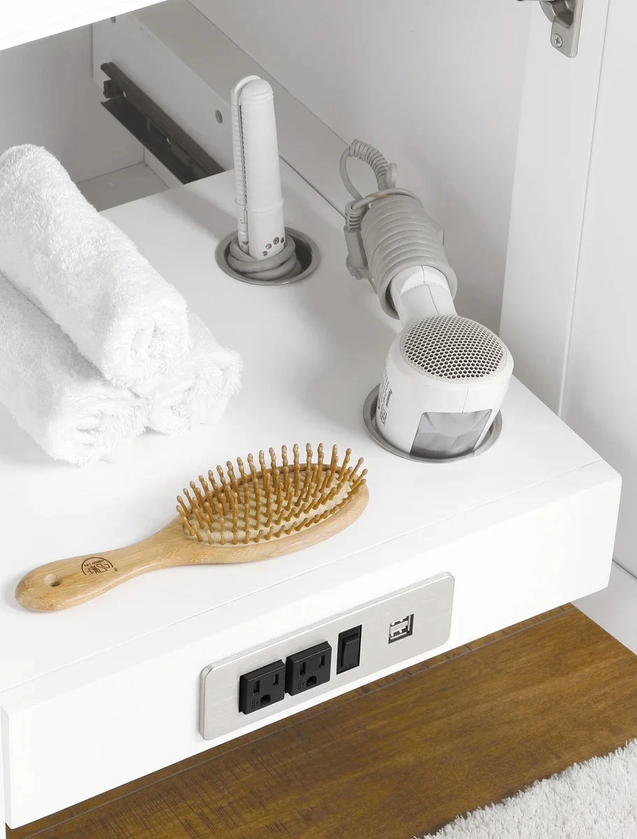 Sophisticated and packed with modern conveniences, the Alonso vanity by OVE Decors will transform your bathroom remodel. This classic white finish statement piece features soft-close cabinet doors and drawers with black contemporary hardware and handy interior drawer separators. Topping it is a crisp white engineered stone countertop with undermount rectangular sink(s) and matching 3-inch high backsplash. Inside, discover a full-extension pull-out shelf complete with convenient hair styling tool holders and a built-in power strip that includes USB ports, plus plenty of storage space to stash all your bathroom essentials. Available in sizes 36”, 42” 60” and 72” in almond latte and white finishes.