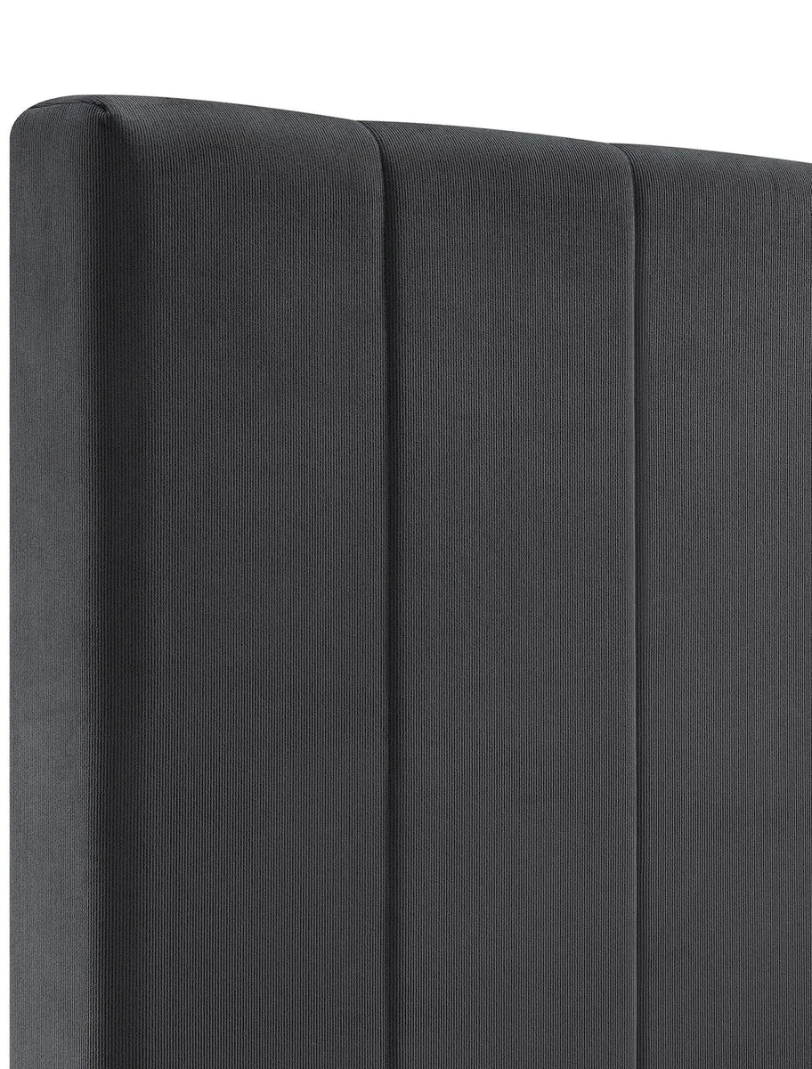 Introducing the Rian Upholstered Bed with designer style and a sophisticated look. Rian is constructed from high-end solid hardwood covered with a soft, durable cord style velvet fabric. Featuring a tall headboard with hand-stitched vertical channel tufting throughout the design. This low-profile platform bed includes durable slats to support your mattress without a box spring and tall metal legs, completing the sleek, luxurious design.