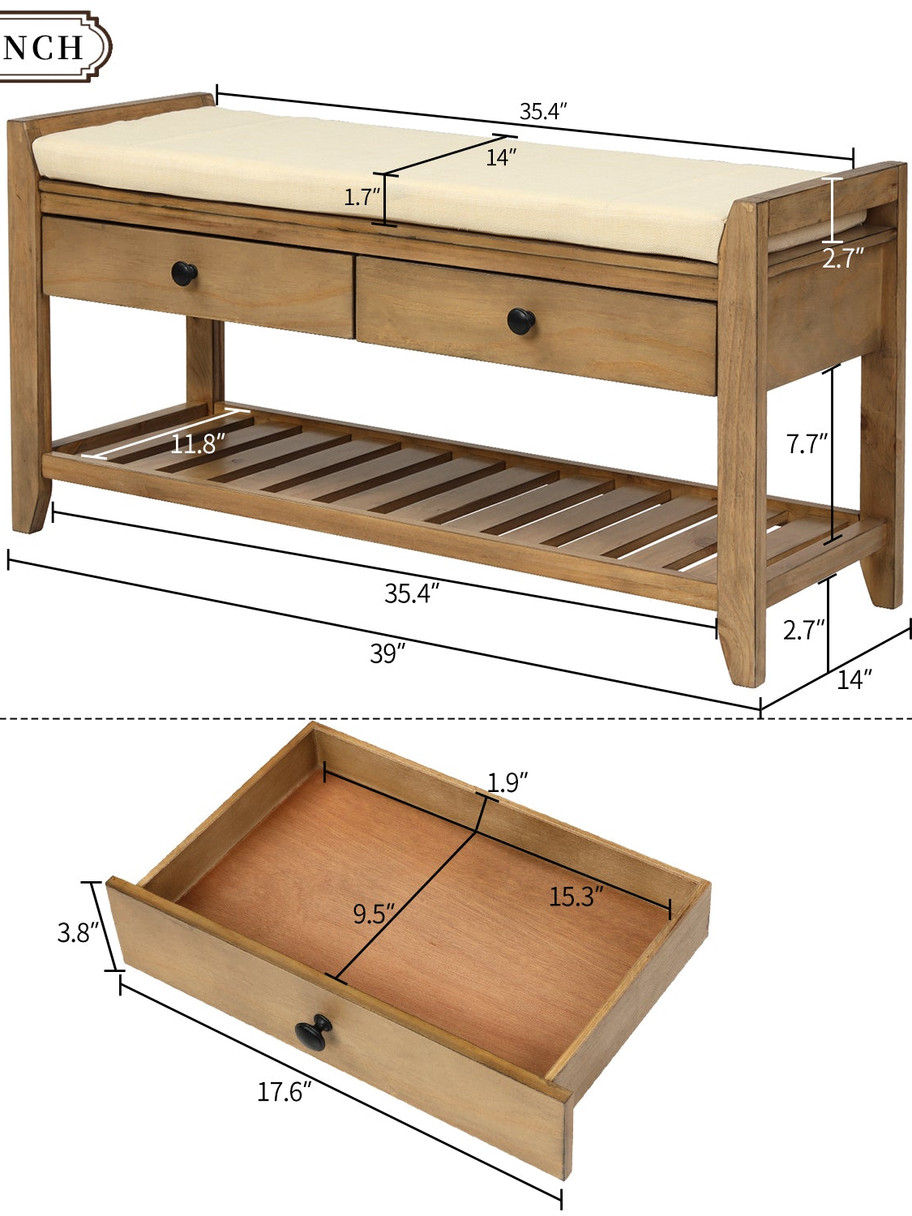 Ideal for family use,this classic bench functions as the perfect inconspicuous storage option to tastefully store your personal belongings rather than leaving them out in the open and accumulating clutter. Two spacious sliding drawers sit directly underneath the upper bench seating area giving you easy access to sandals, kids' shoes and more while the underside gridded rack can hold additional shoes or storage baskets to add your own personal touch.