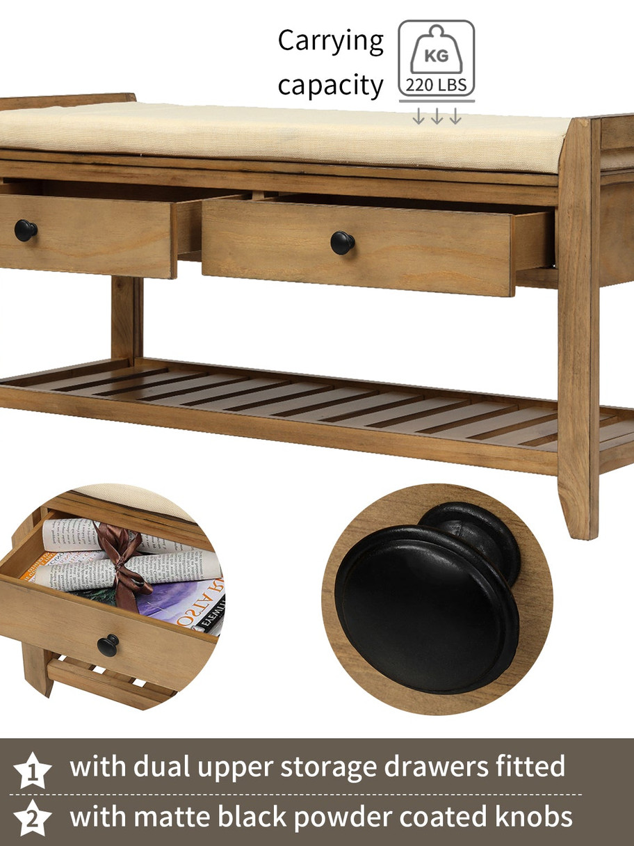 Add a touch of organic essence to your abode with this wooden storage bench. The taupe slightly weathered natural wooden finish adds the perfect understated accent to any home, blending in seamlessly with any surrounding décor with 5 shades to choose from. The carefully crafted silhouette emphasizes classic details, including tapered legs and a gridded base shoe rack with dual upper storage drawers fitted with matte black powder coated knobs.