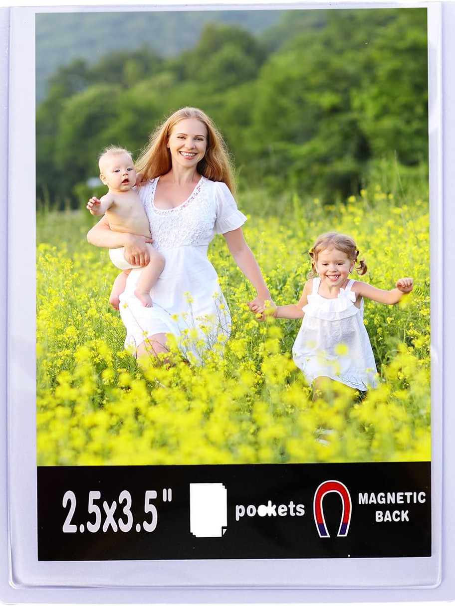 - Magnetic photo sleeve frame,Includes 15 pcs 2.5" x 3.5". With a white backing, it is perfect for exhibiting photos, pictures or prints.Widely use on a refrigerator, filing cabinet, steel door, magnetic whiteboard or other metal surface