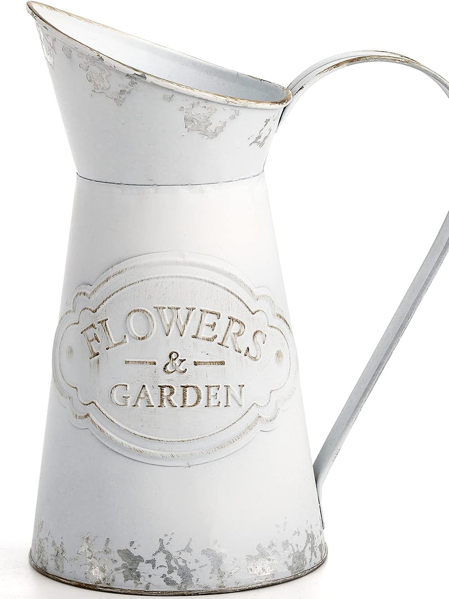 - Premium Material: The decorative pitcher is made of excellent galvanized hard metal, the handle and the milk can are tightly reinforced. 100% handmade, skillful workmanship combined with quality iron materials, adding a touch of farm cottage style to your home. Note: please put a bag or plastic bottle in it to hold water if for fresh flowers because it will leak.
