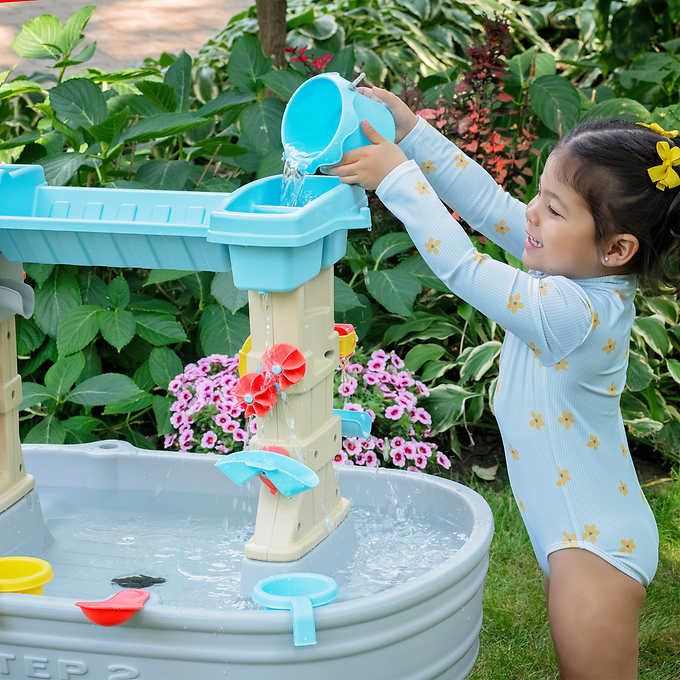 Fun is always in the forecast with the Rain Showers and Flow Water Table! The open 360-degree play area of this outdoor water table for kids is just the right size for multiple toddlers to explore together, each staying entertained with their own set of activities. The top tray has three isolated sections to deliver multiple paths of water. The first section features a large spinner with a knob that can be turned to change the water flow. The middle section offers a sensory rainfall experience, while the third section sends water through a put-and-place maze wall with enough pieces and places to create twenty-four different paths for water! Kids can dump, scoop, and splash their way into exploring cause-and-effect principles while having a great time.