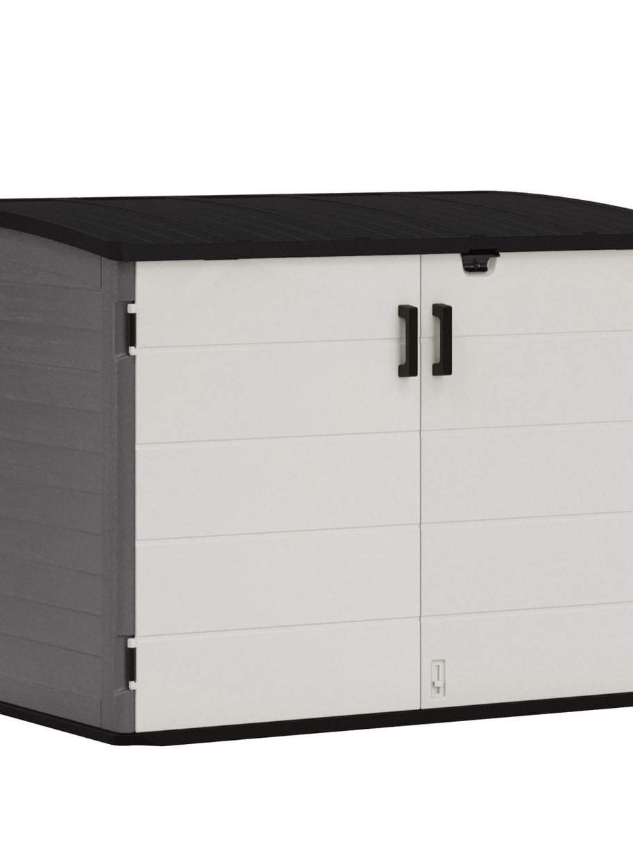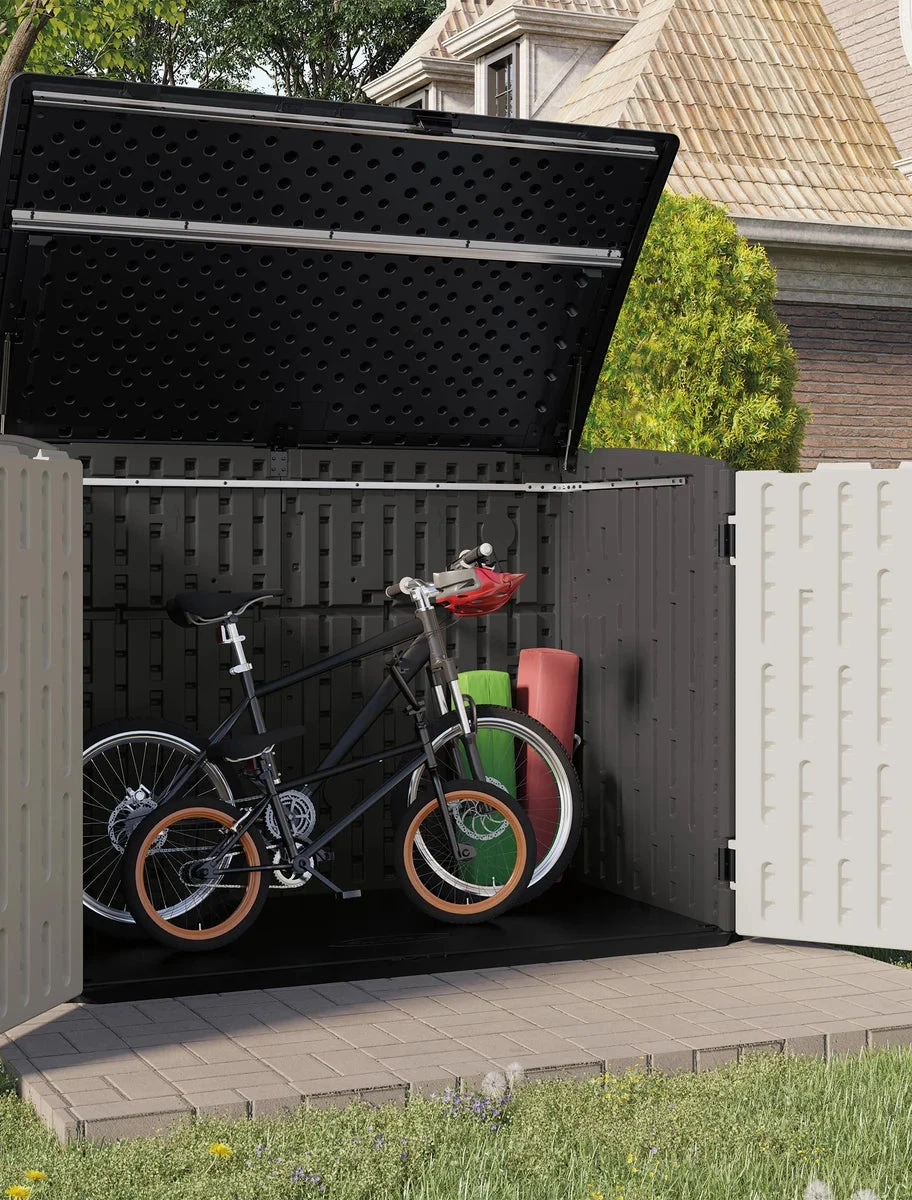 At 70 cu. ft., this Horizontal Shed by Suncast is the perfect solution for hiding your unsightly garbage cans and organizing your lawn and garden equipment. The storage space is sufficient for holding up to two – 96-gallon waste containers or it can house other items such as furniture cushions, bicycles, firewood, and gardening supplies. Two front-opening doors along with the top-loading lid allow easy access to your items. Gas shocks assist for a one-handed lift operation and ensures that the lid will stay open while in use. Additionally, this horizontal shed has a soft-close hinge that is designed to prevent the lid from closing too quickly or slamming shut. Constructed of steel-reinforced, multi-wall resin, this durable shed is built to withstand the elements throughout any season.