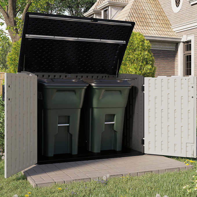 - Perfect for storing up to two 96-gallon waste containers, bicycles, or firewood