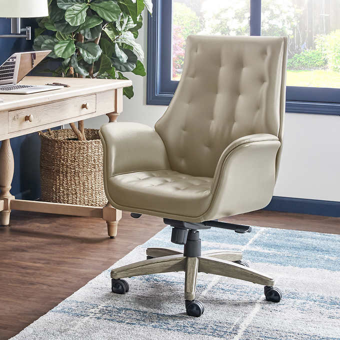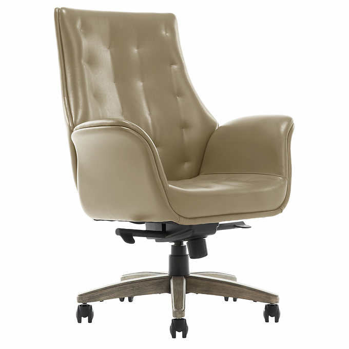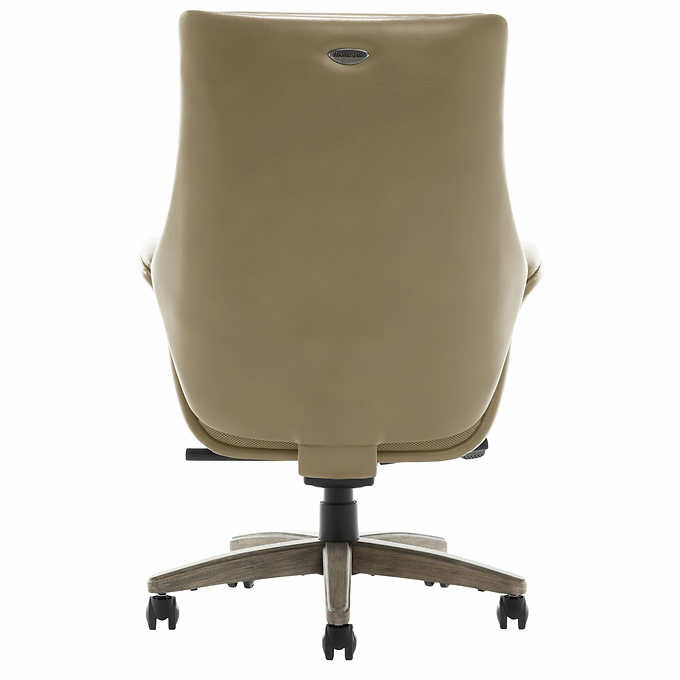 - Curved armrests are completely cushioned in leather for all-over comfort