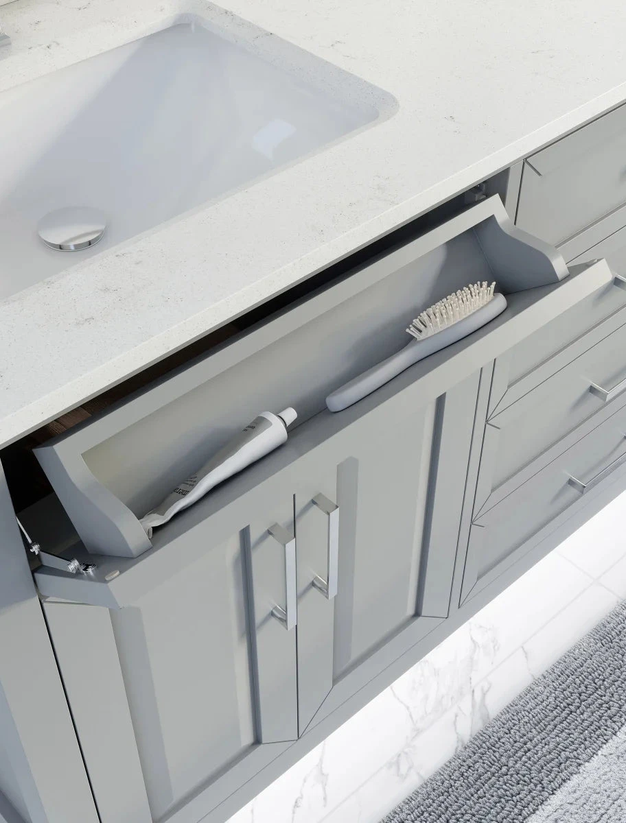 - Advance technology Vanity with soft closing pull-out Power outlet shelf (2 Power outlets & 2 USB slots) with Ring Appliance holder that gives you flexibility to provide power for a variety of electric devices