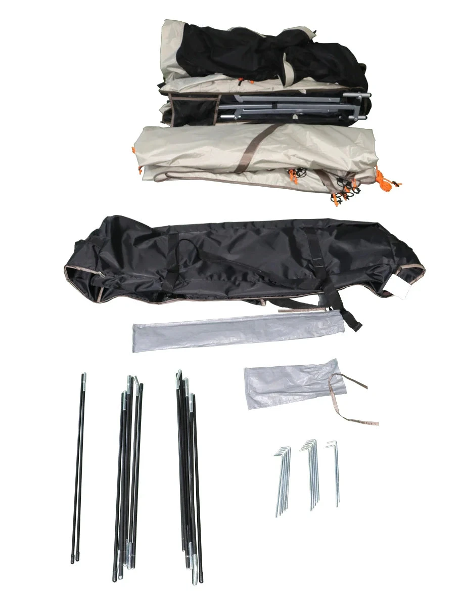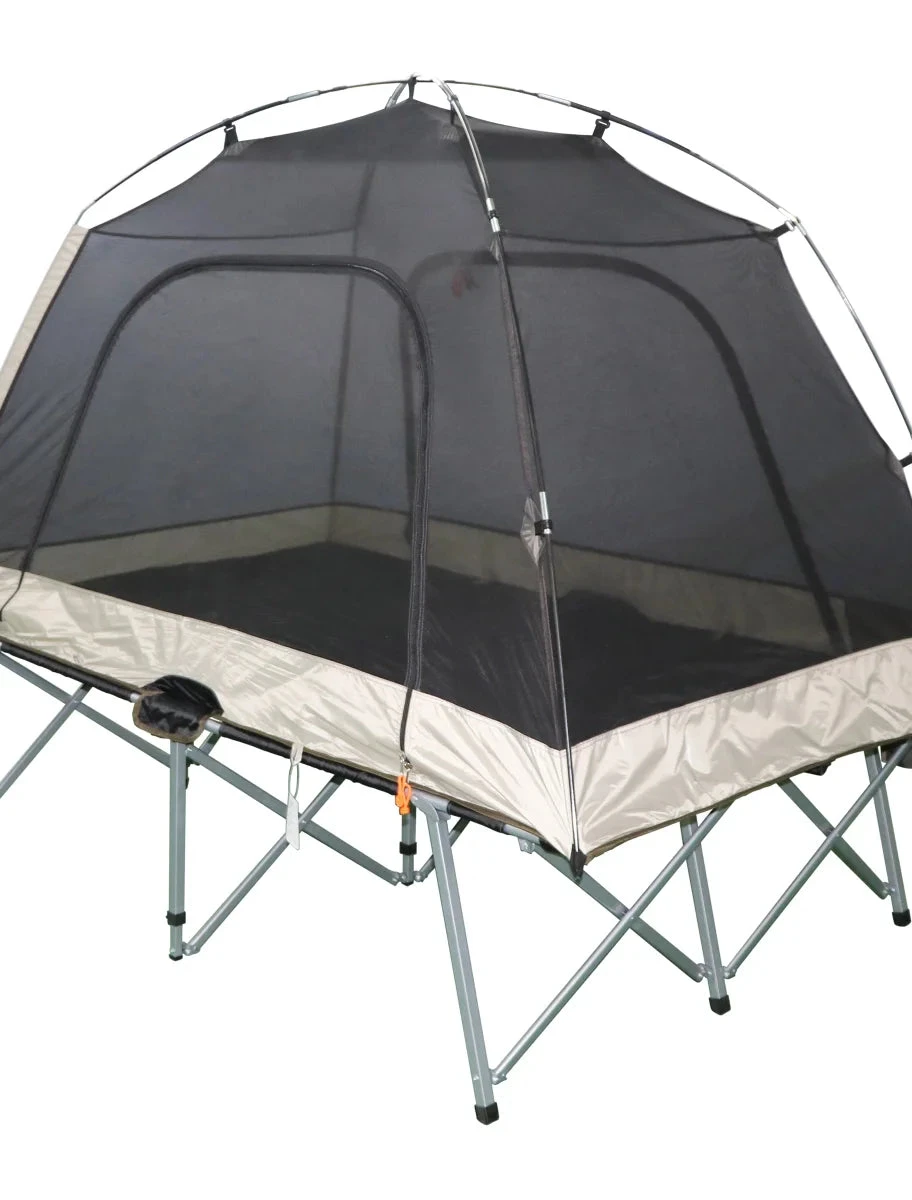 - Convenient Instant Folding Steel Cot with Attached Tent and Full Coverage Rain Fly