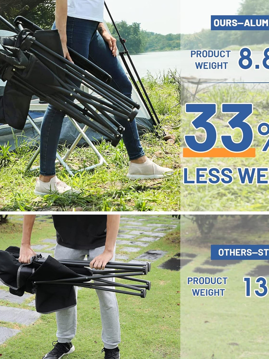 - Big size and lightweight:The expanded size is 17 3/4L*25 1/4W*36 1/8H inches; The folded size is 11 3/8"x 9 1/2"x 34 5/8", and the weight is only 8.87 pounds, but the maximum supporting weight is 300lbs. This is the size and load-bearing adult chair suitable for most people