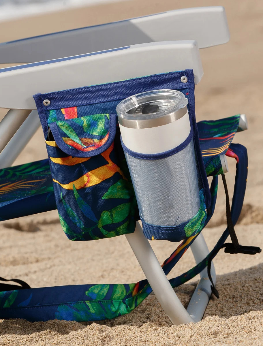 Includes a side pouch with a convenient drink holder and cell phone pocket.