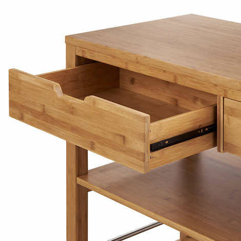 Trinity's 48" Bamboo Kitchen Island w/ Drawers is a great blend of form and function. Its sleek and modern design features a solid bamboo top, (2) shelves, (2) drawers, casters for easy mobility, along with stainless steel handles and hardware. The large 100% solid bamboo top is a perfect working surface, and the (2) 45"W x 20"D shelves and (2) 20"W x 13.5"D drawers add additional storage space for all your cooking utensils, pots, pans, and everything in between. Look no further, this Kitchen Island does it all!
