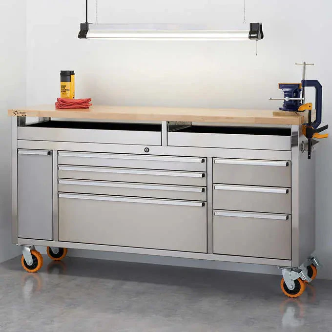 TRINITY 66" Stainless Steel Rolling Workbench with Clampable Raised Top