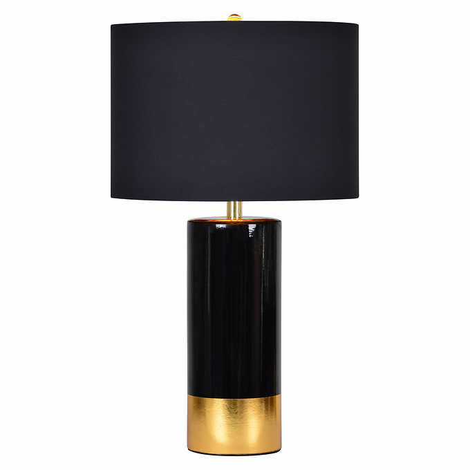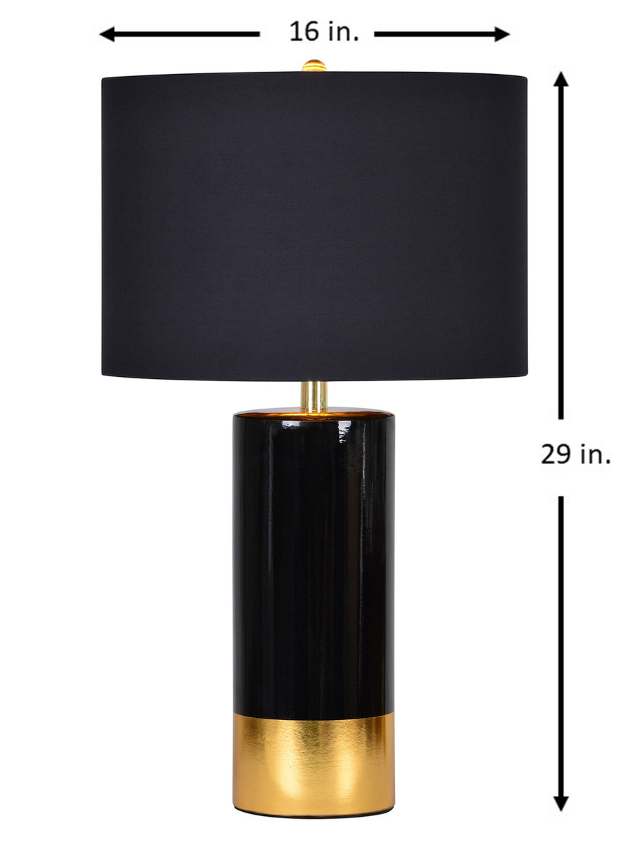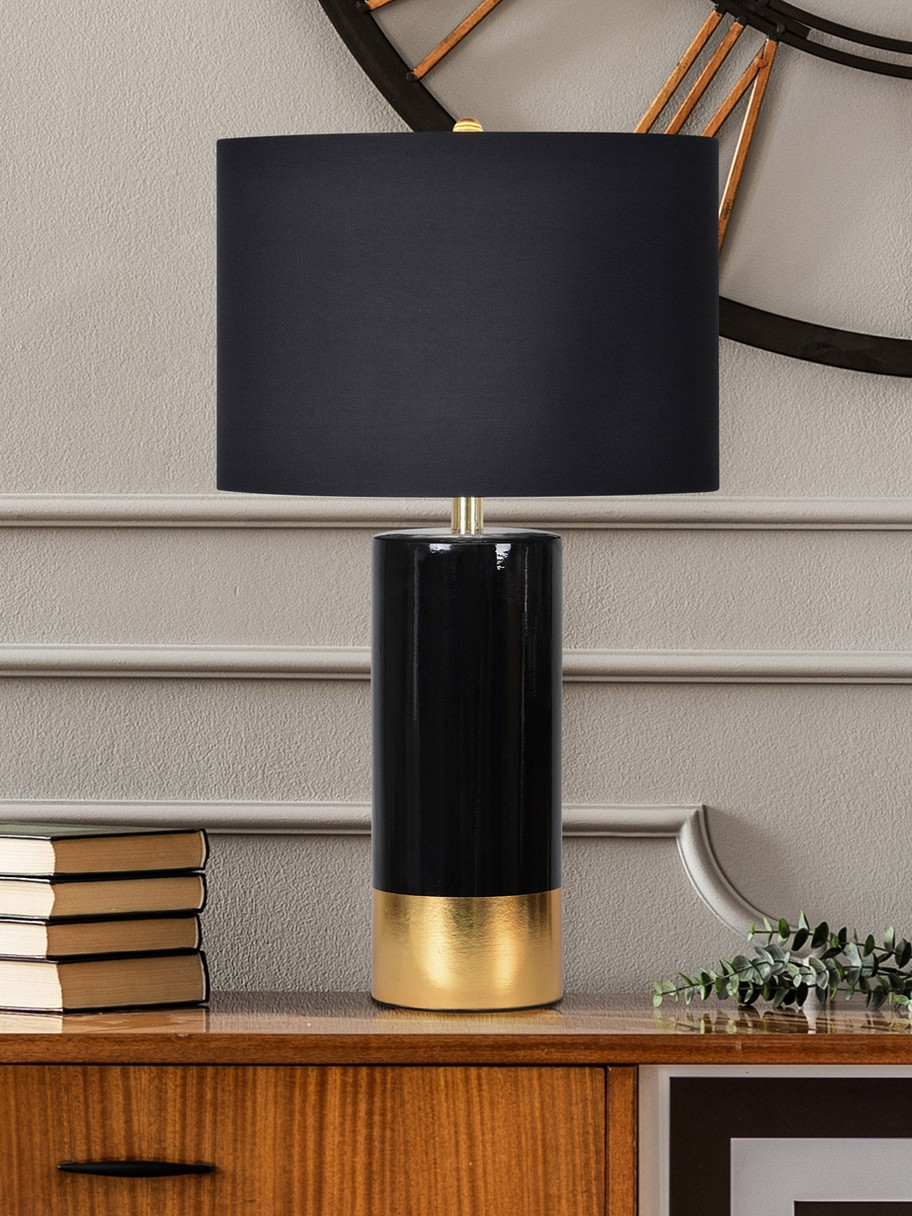 This black and gold contemporary table lamp brings a touch of Hollywood glamour to any interior. A solid black round shade is lined in gold, reflecting the colors in the base.