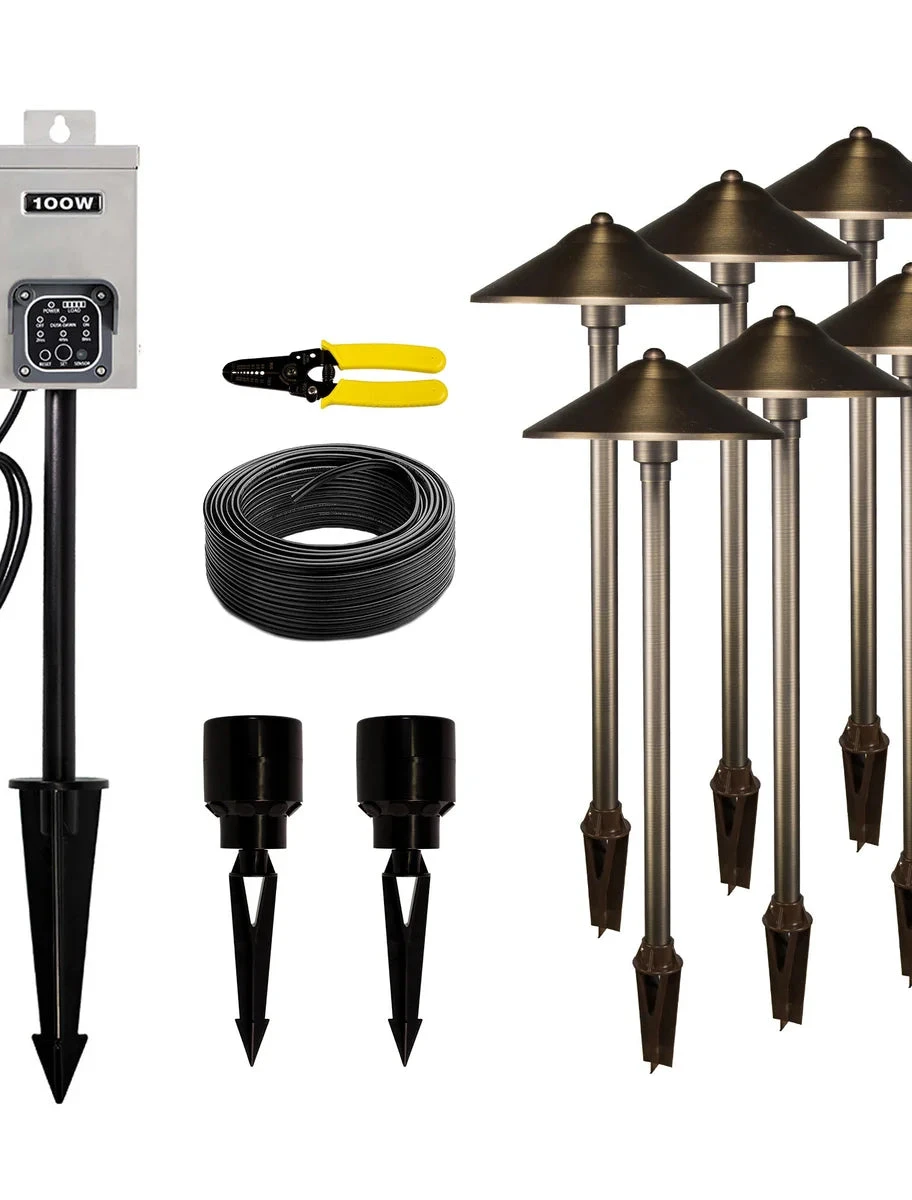 - 6x VOLT® Brass Path & Area Lights with Attached Stakes and 25' of Lead Wire