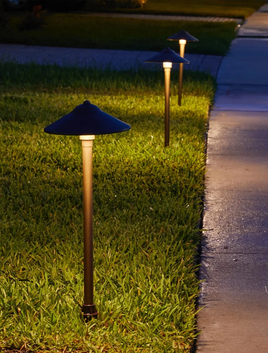 - 7x VOLT® Brass Path & Area Lights with Attached Stakes and 25' of Lead Wire