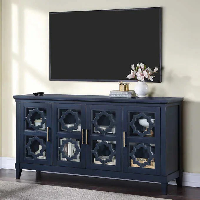 Enhance your décor with the 70” Westbury Console. This console is not only beautiful, but highly functional. Use it as your media cabinet or as a decorative accent piece. Westbury is completed in a hand applied multi step finish that truly makes a statement. At 70”W, you’ll have plenty of storage space for all of your needs. It features adjustable shelves, and wire management to accommodate your media components. You can change the look of your console depending on the front panels you choose. It’s comes with wood and glass panels to give you an all glass look or an all wood look that is enhanced further by the decorative medallion accents. The antique hardware is the perfect finishing touch to this new addition to your home