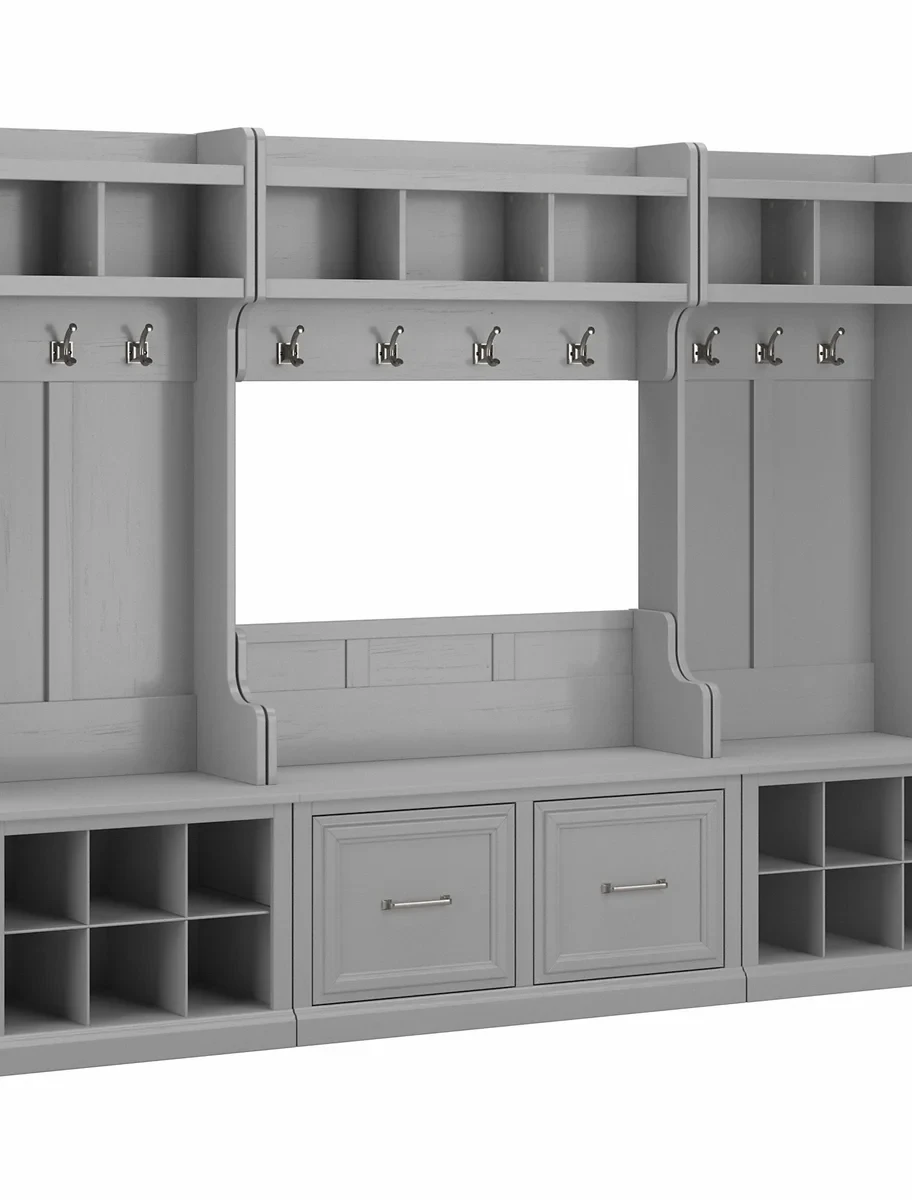 The Bush Furniture Woodland Complete Entryway Storage Set with Wall Mounted Coat Rack and Shoe Bench with Doors combines transitional styling and a practical design to offer an ideal organization solution. Durable benches allow you to sit down to put on your shoes or set shopping bags down. Two storage cabinets and cube shelving store footwear for a clutter-free entryway, mudroom, or foyer.