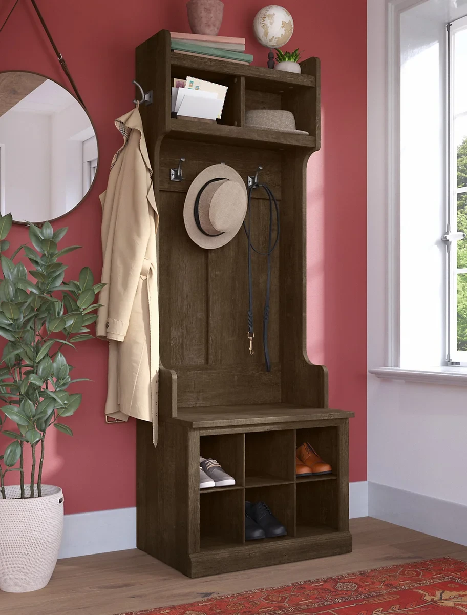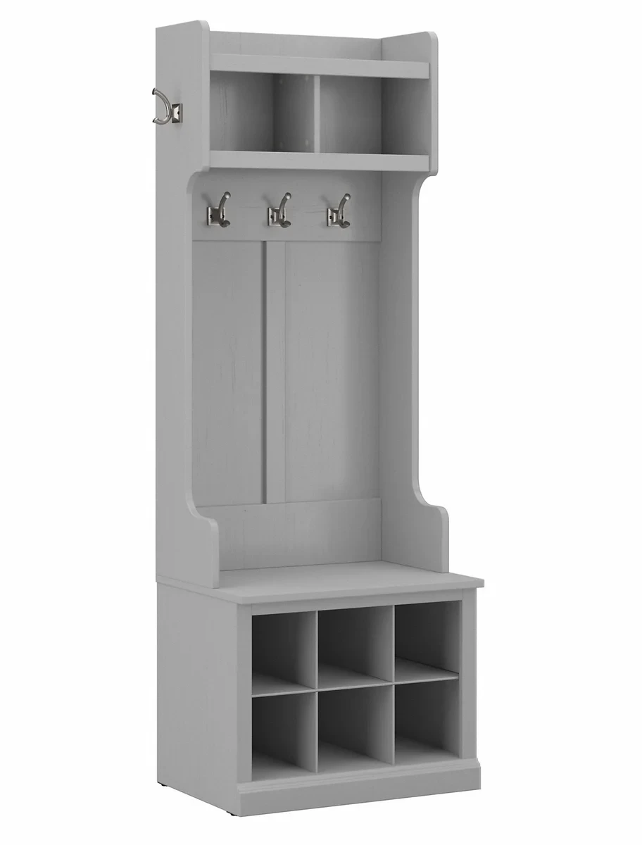 The Bush Furniture Woodland 24W Hall Tree and Small Shoe Bench with Shelves combines transitional styling and a practical design to offer an ideal entryway organizer. Have a seat on the durable bench surface and take a moment to relax as you get ready to head out the door or come home after a long day. The mudroom bench supports 250 pounds, so you can sit down to put on and take off your shoes or set shopping bags down after a trip to the store with confidence. Six cubby spaces keep your home's entrance organized while providing easy access to footwear. The narrow Hall Tree features five coat hooks for hanging jackets, hats, scarves and more. Smaller items can be stashed neatly inside two open compartments. This entryway bench with storage has been tested to meet Bush Furniture's standards for safety, performance and durability.