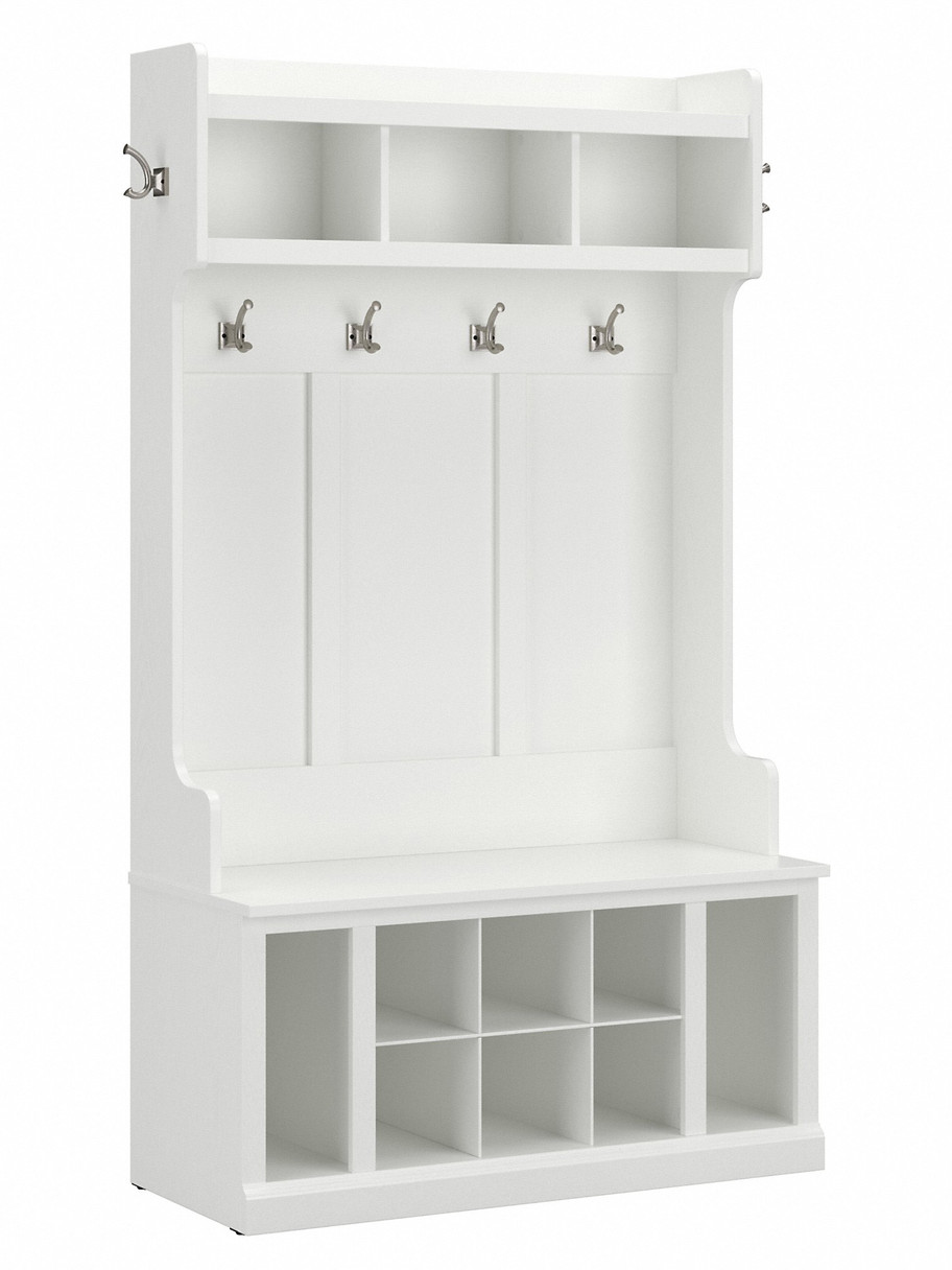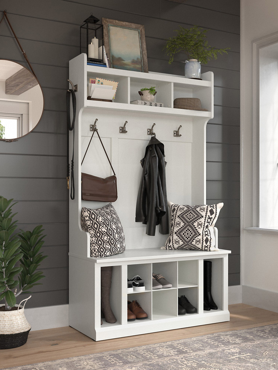 The Bush Furniture Woodland Shoe Bench and Hall Tree combines transitional styling and a practical design to offer an ideal entryway organizer. The sturdy bench allows you to sit down to put on and take off your shoes or set shopping bags. Open storage includes cubby spaces and side vertical shelves to keep footwear in order.