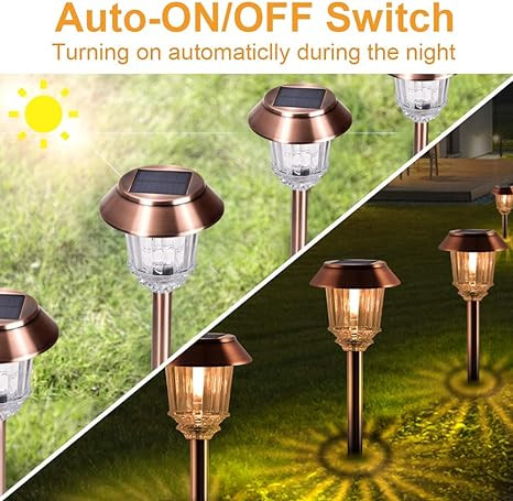 - [WIDE APPLICATION & LIGHT UP YOUR WAY] Solar powered outdoor lights can be placed everywhere like your garden, path, patio, lawn, pathway, driveway, front yard, villa, landscape, balcony, and outdoor places. The soft warm light can help create a perfect atmosphere when you take a walk with your family, friends, and so on. No worry about the battery will short circuit in rainy weather and the LED filament outdoor solar lights pathway will be polluted by dust and cause insufficient illumination.