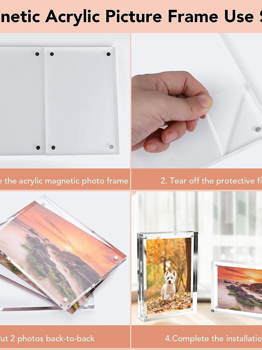 - [Premium Material]: Acrylic Frames are made of high quality acrylic and consist of two acrylic photo frames and four magnets. You can display two sheets together. Acrylic is transparent, you can clearly display the photos you want to show, etc., but also to achieve the role of photo protection.