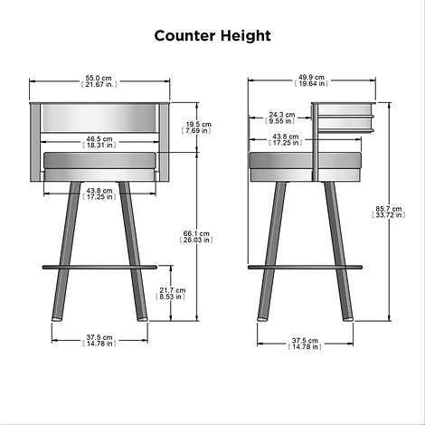 Counter Stool Dimensions: W x L x H - 55.4 cm x 49 cm x 85.7 cm (21.8 in. x 19.3 in. x 33.75 in.)