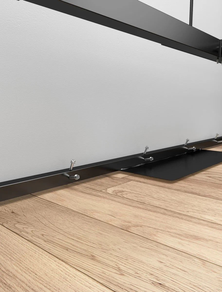 - Installation requires attachment to wood studs or masonry, removal of the baseboard, and drilling into the floor. If disassembly is required, holes may be covered with baseboards 1.27 cm (0.5 in.) or thicker