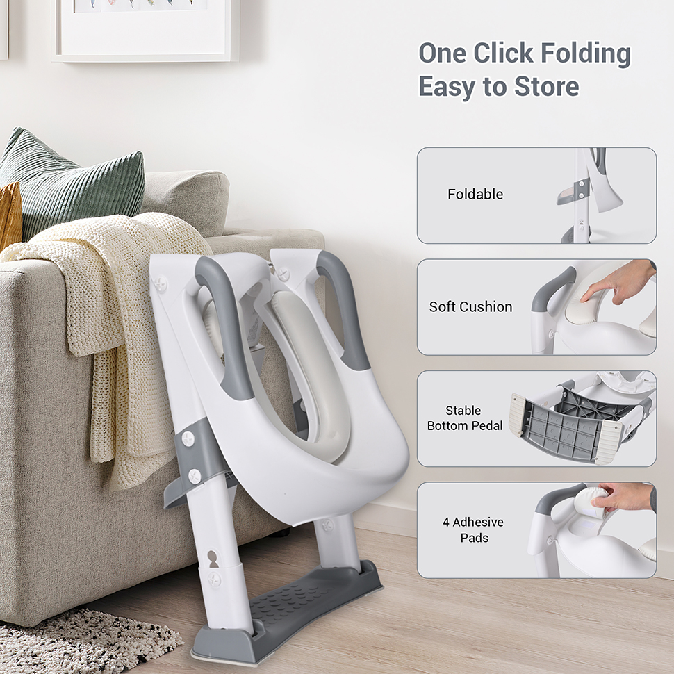 The foldable potty toilet training seat offers convenient portability and storage. It can be easily folded when not in use, making it ideal for traveling or smaller bathrooms where space is limited.