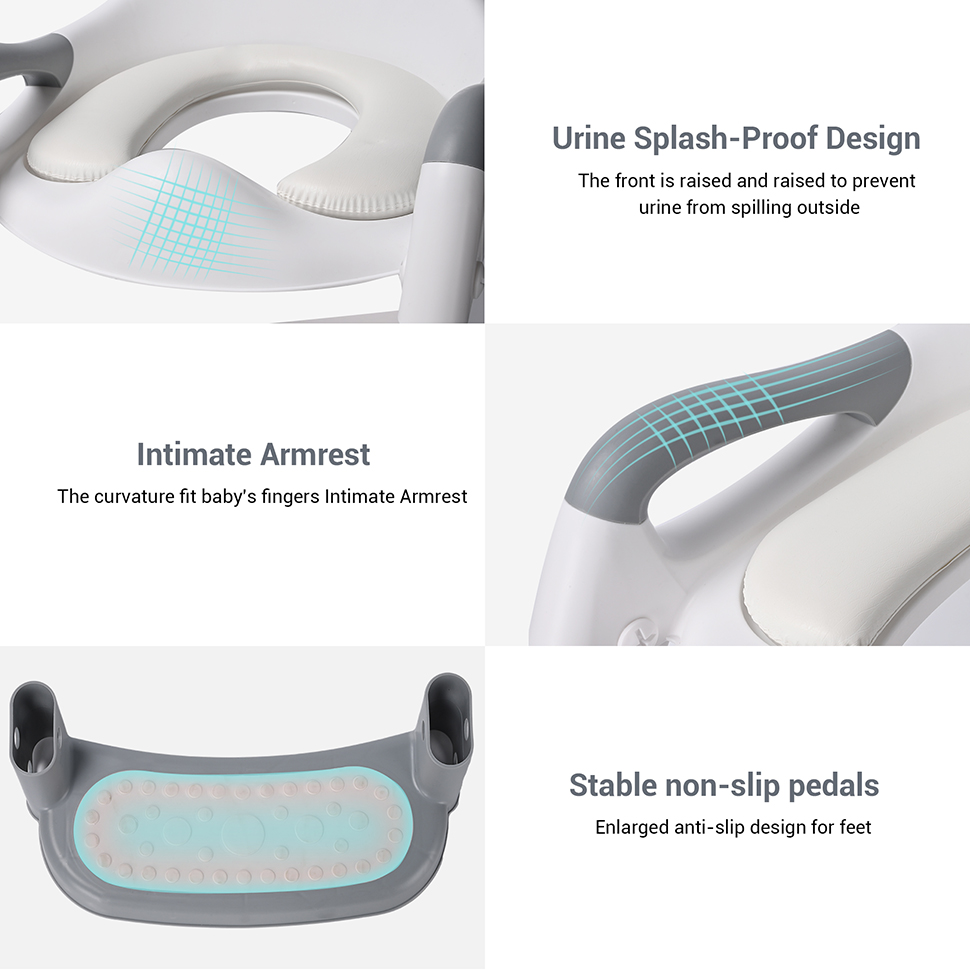 Our potty training seat has an embracing backrest design to protect your baby's spine. Anti-splash urine design prevents baby from urinating. The step stool and ladder feature non-slip surfaces, minimizing the risk of falls and providing a secure foothold for children. This safety measure enhances the overall user experience and promotes a sense of confidence.