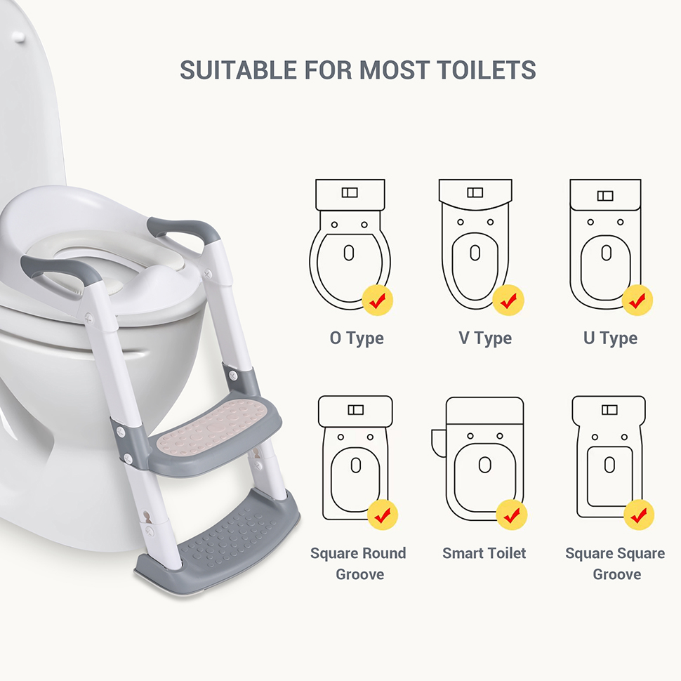 The toilet training seat is suitable for V-shaped, U-shaped and O-shaped toilets. The foldable design makes the potty training ladder easy to move, so you can put the toilet training seat aside when you don't need it.