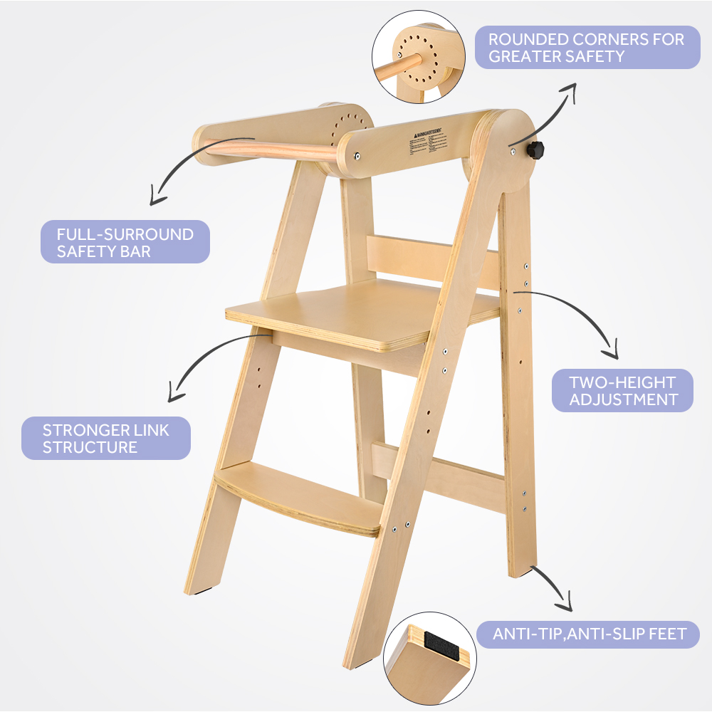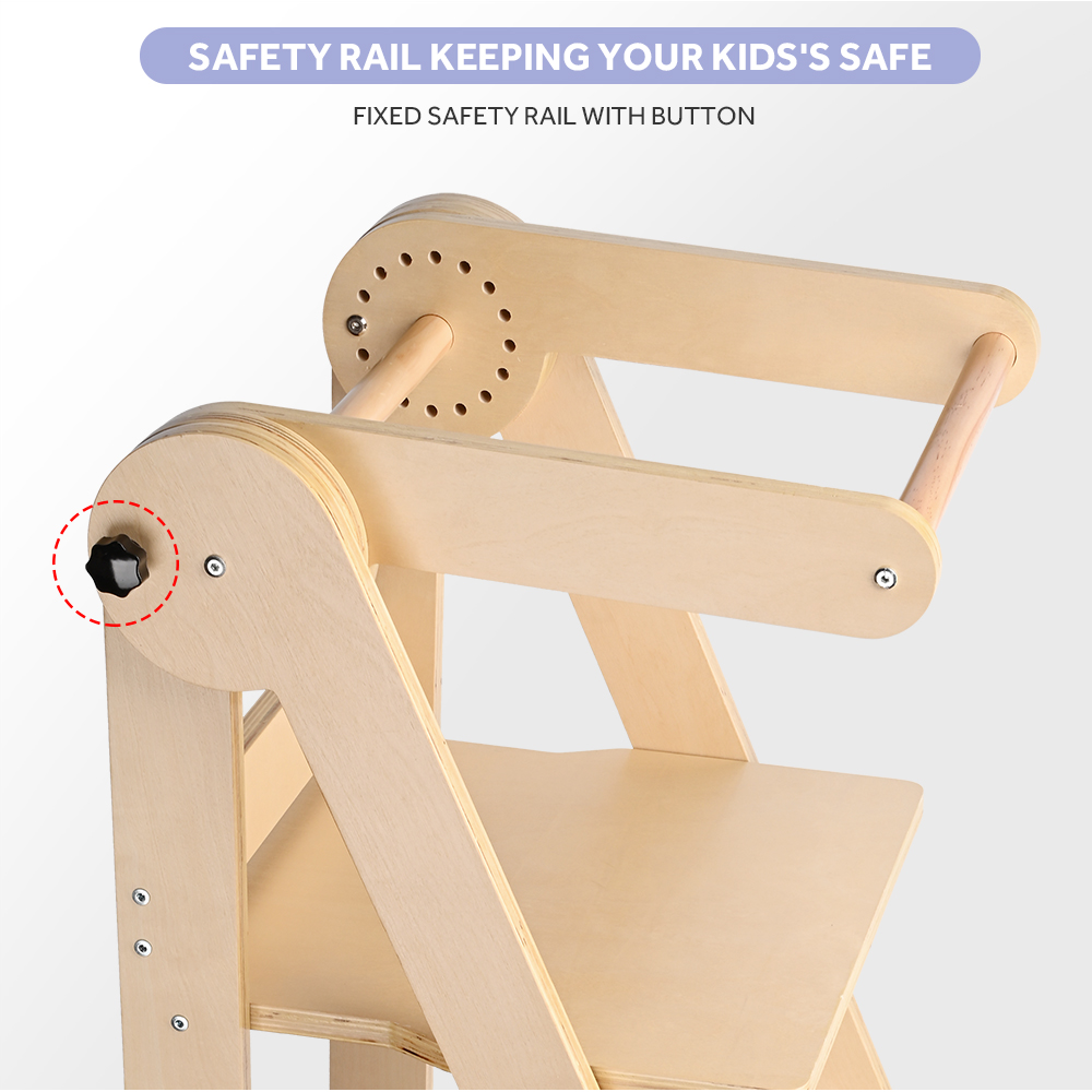 With the safety rail, it can make sure your baby won't fall out from the high stool, so you can spend more time on your own business. With the adjust button, the rail is freely rotated up and down for different heights.