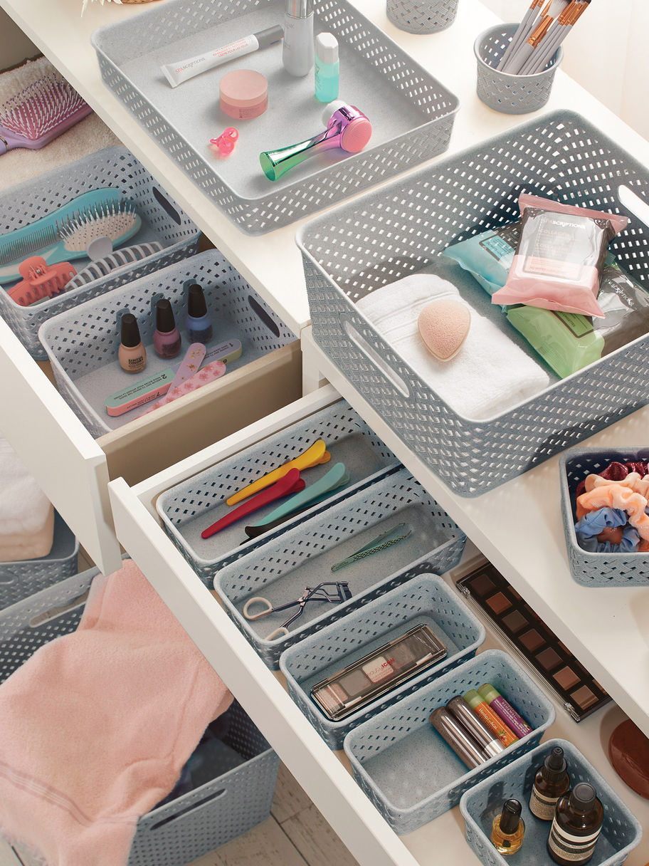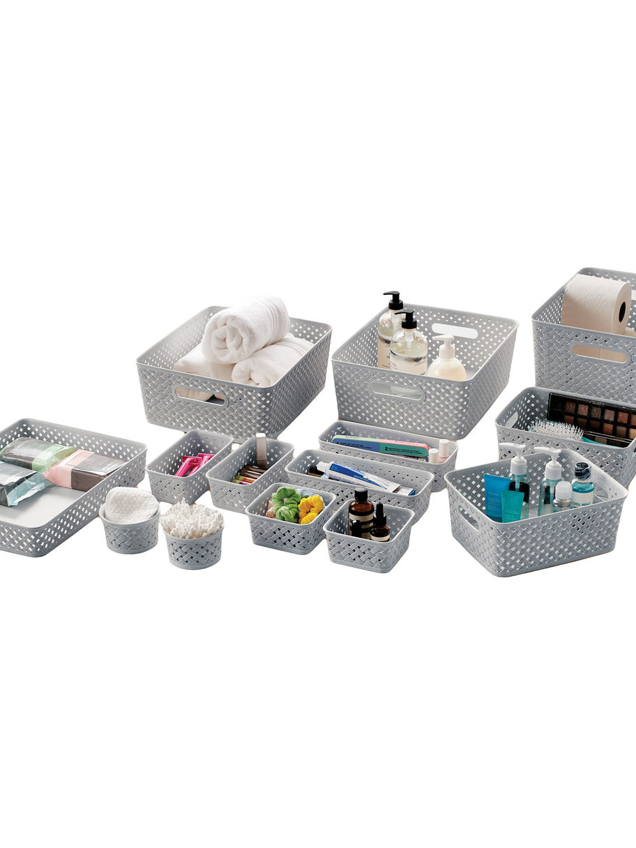 Storage basket set made with polypropylene and durable wheat straw fiber. Great for bathroom, closet, kitchen, pantry, office and more.