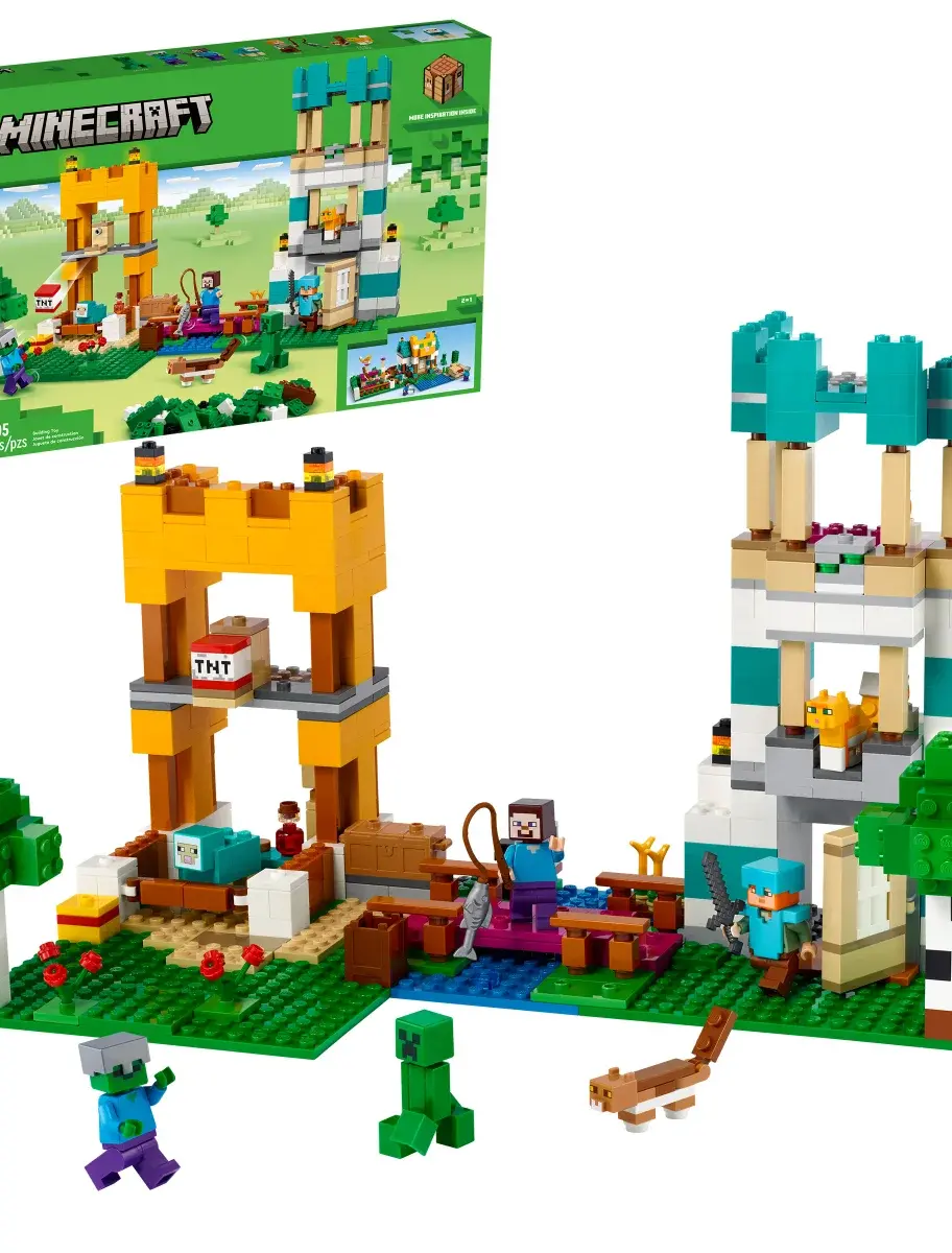 This endlessly versatile playset offers 2 different scenarios for kids to build: the River Towers, a fortress-like structure that can be used to defend against a zombie and Creeper attack; or the Cat Cottage, which consists of a large, cat-shaped house with a cat playground next to it. These distinct builds, along with suggested models designed to inspire kids’ creativity and the countless structures they build from their own imaginations, are populated by iconic figures and mobs from the game, including Steve, Alex, a zombie, Creeper, cats and sheep.