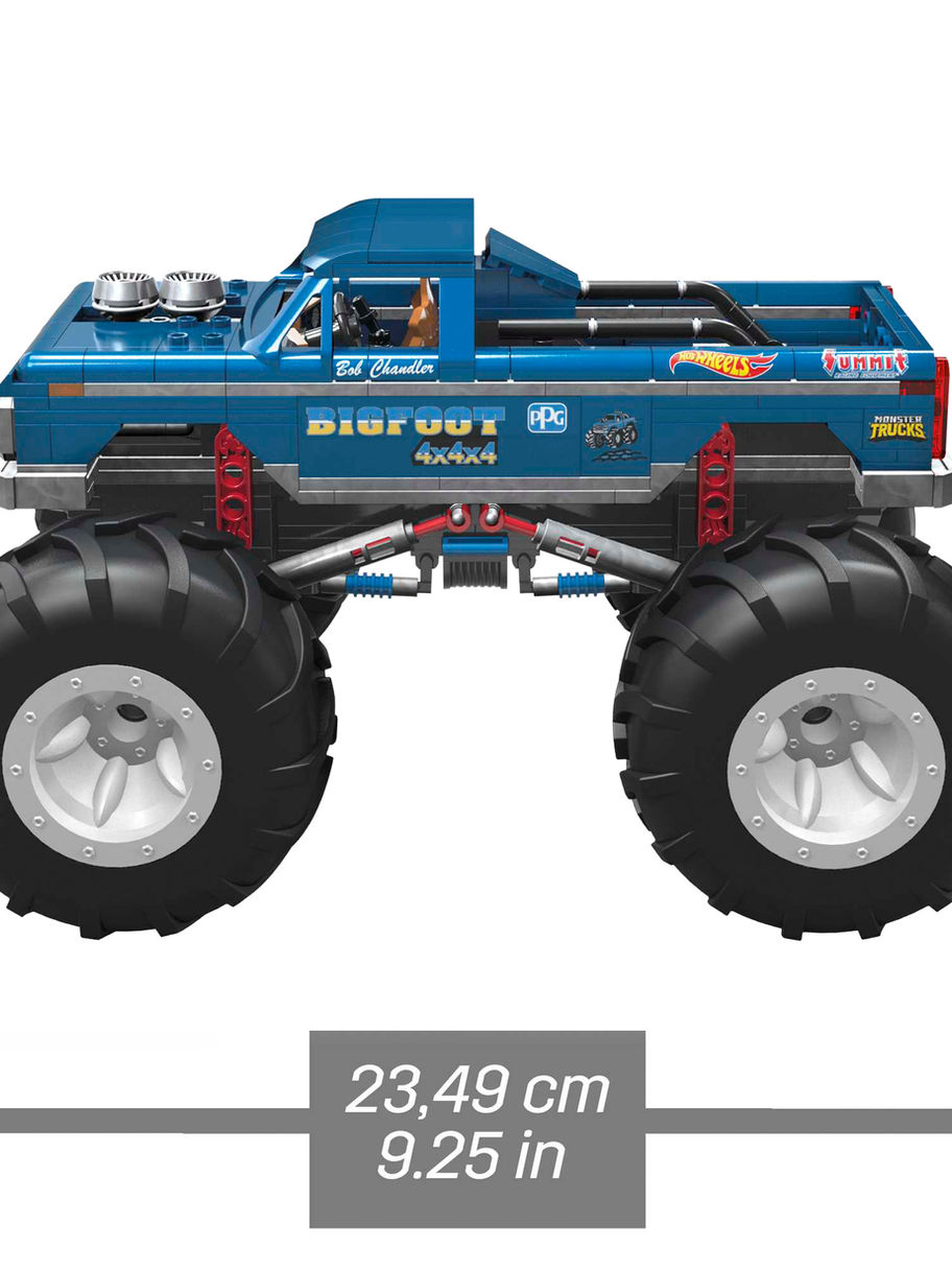 - 538-piece large scale 1:18 Hot Wheels BigfootMonster Truck Adult Builder's set with authentic design elements and iconic graphics and deco