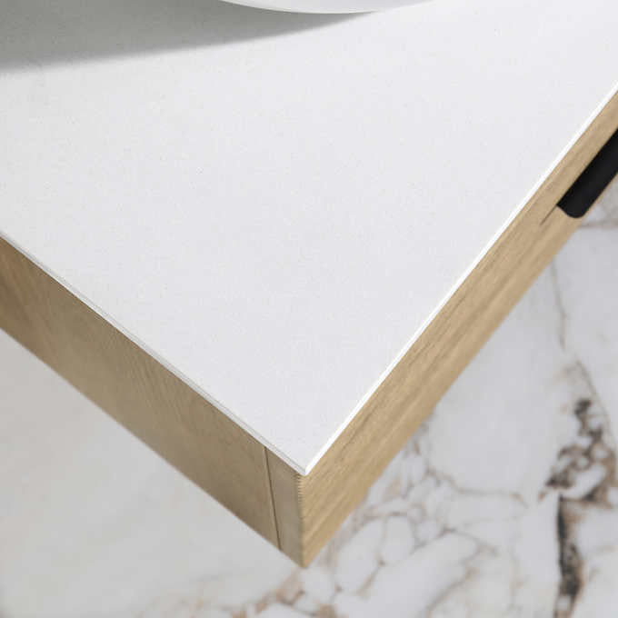 With its distinctive horizontal fluting design, the Archie single vanity by OVE Decors offers style for miles. It features fluted drawer fronts, an on-trend natural oak finish and sleek hardware for a modern and refined look. Installed with a floating mount design, it helps keep even the smallest bathrooms and powder rooms feeling spacious while its two drawers provide ample storage for all your essentials to help maintain a clutter-free space. Topping off this great-looking vanity are a stunning white engineered marble countertop and round vessel sink that blend function, ease of care and sculptural beauty perfectly.