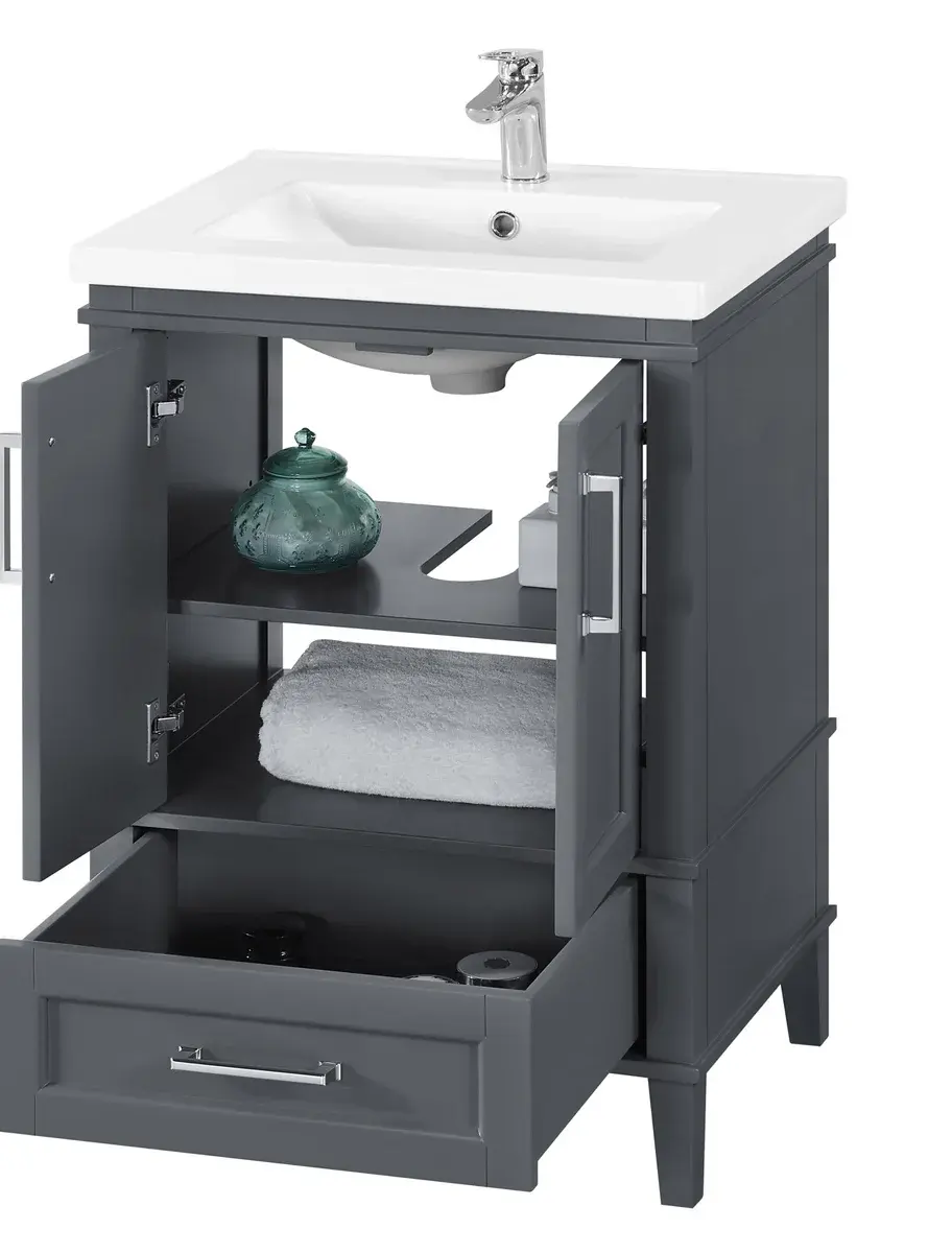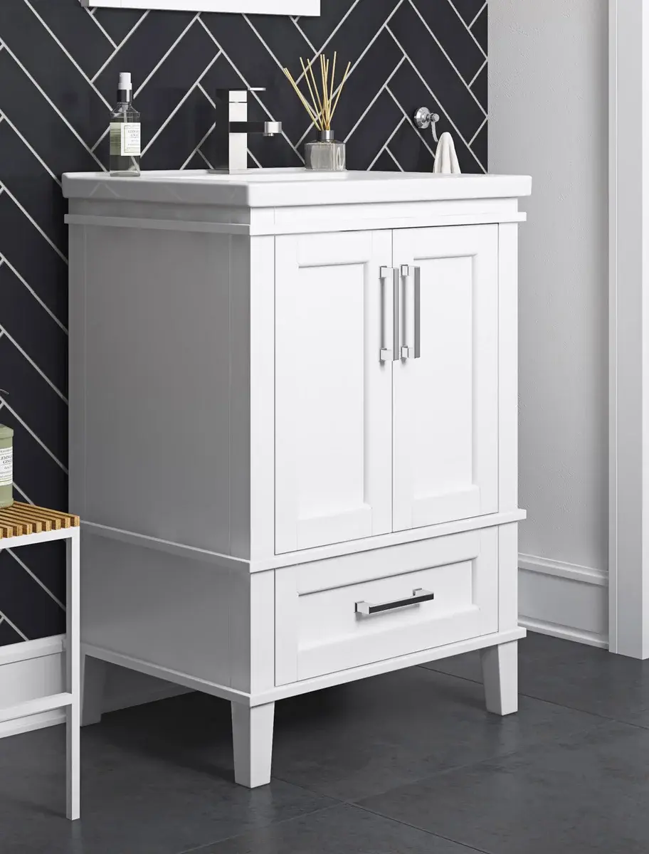 With the Navata 24 inch bathroom vanity by OVE Decors, set your bathroom renovation on the right tack. Its shipshape compact design, from a contemporary white porcelain one-piece countertop with integrated rectangular sink basin, panelled wood cabinetry with freestanding levelling feet and trim chrome bar handles, strikes a jaunty note. A variety of storage in its two door cabinet with an adjustable single shelf plus a soft close bottom drawer.
