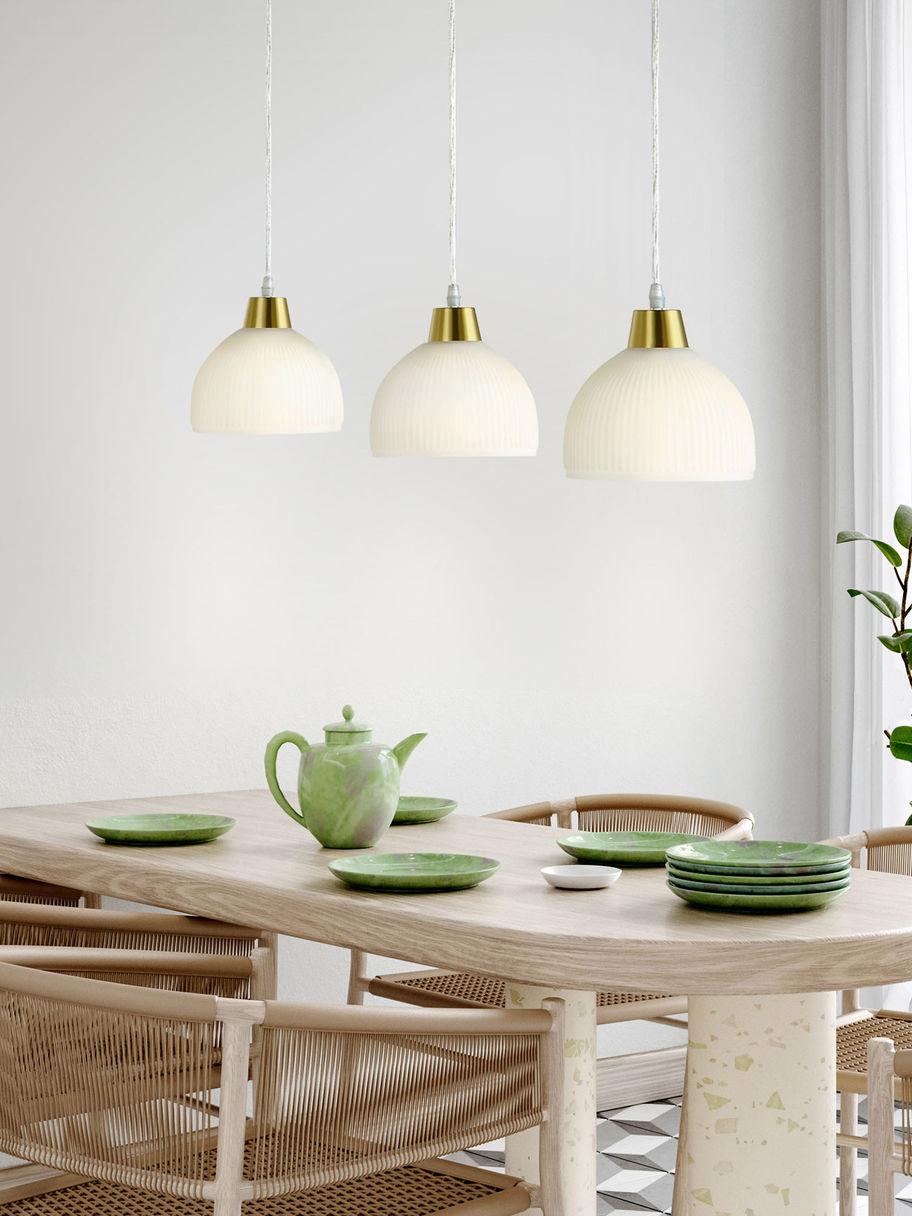 With a knowing nod to contemporary design, the Zuleika 3-pendant fixture is ready to make a modern statement in your home. Perfect for over a dining table or kitchen island, its brushed gold structure suspends three textured opal glass shades to deliver ambient lighting with an enchanting glow. This beautiful light comes with all the mounting hardware you need plus three long-lasting LED bulbs to make it as convenient to install as it is a pleasure to use.