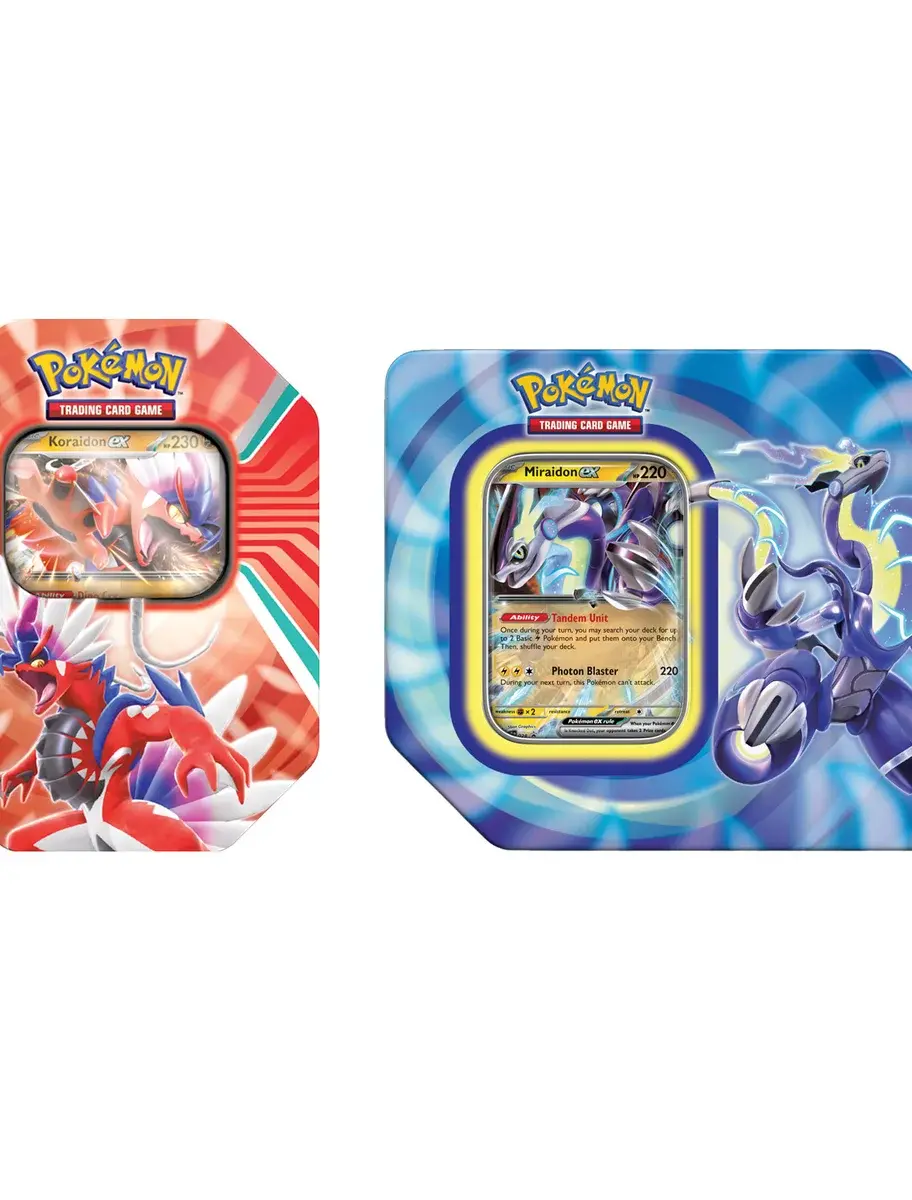 Traverse the hills, waters, and sky of the Paldea region with 2 Legendary Pokémon by your side! The primal intensity of Koraidon ex and the polished fortitude of Miraidon ex. Build up your collection even more with the Pokémon TCG: Paldea Legends Window Tin and ex Tin bundle.