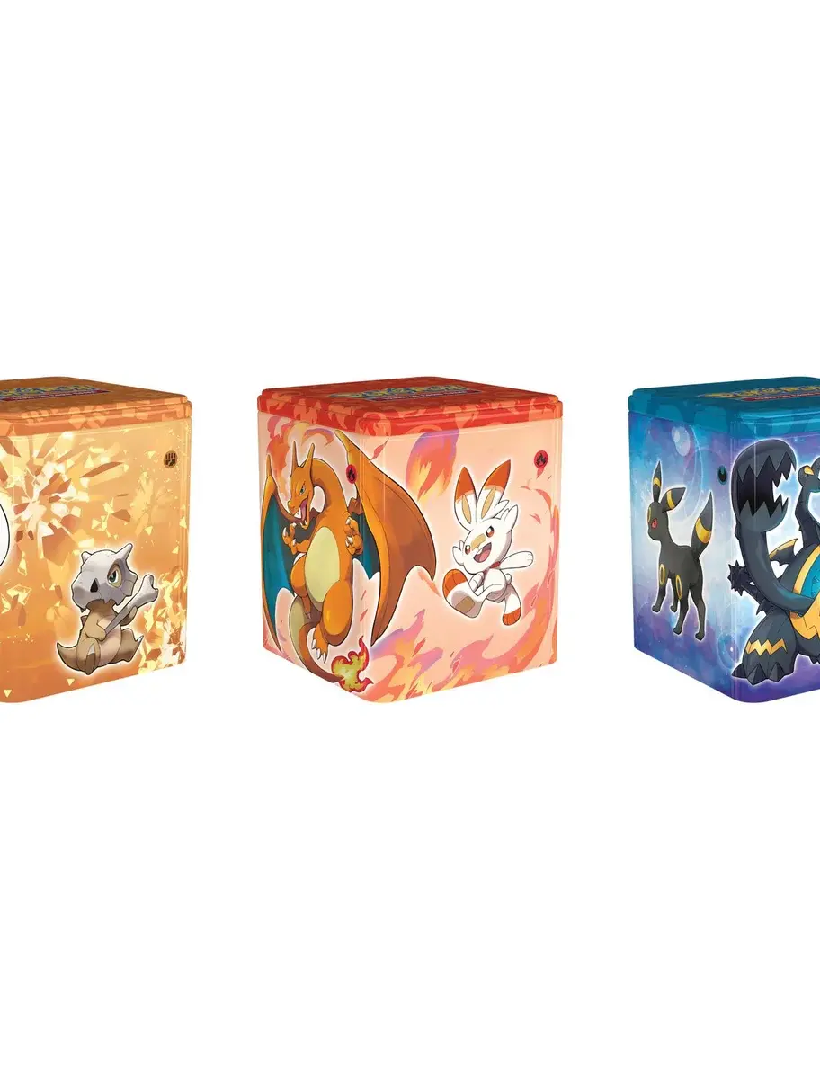Stack ‘Em High! Which tin matches your type? Take your pick with three different designs! Each handy Pokémon TCG: Stacking Tin stacks neatly with others.