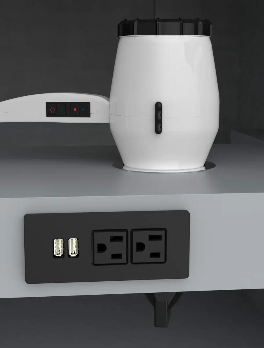 Power outlet and 2 USB slots with soft closing pull-out Ring Appliance holder to store Hair dryer.