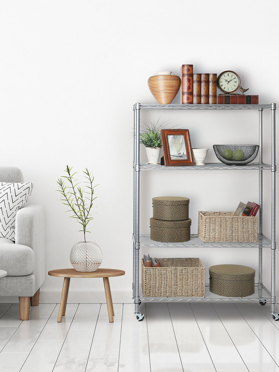 These multipurpose shelving units are ideal for use around the home, garage, and office. Our units are built with commercial-grade steel and finished in silver for durability and resistance to corrosion in dry storage environments. System features wide (91.44cm x 35.56 cm) (36 in. × 14 in.) shelves engineered from heavy-duty steel wire for strength and low-weight. This model includes wheels and leveling feet for mobility and stability when you need it.