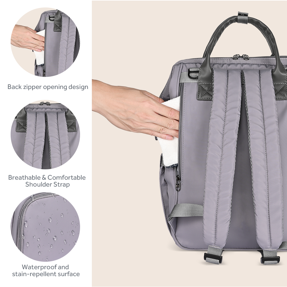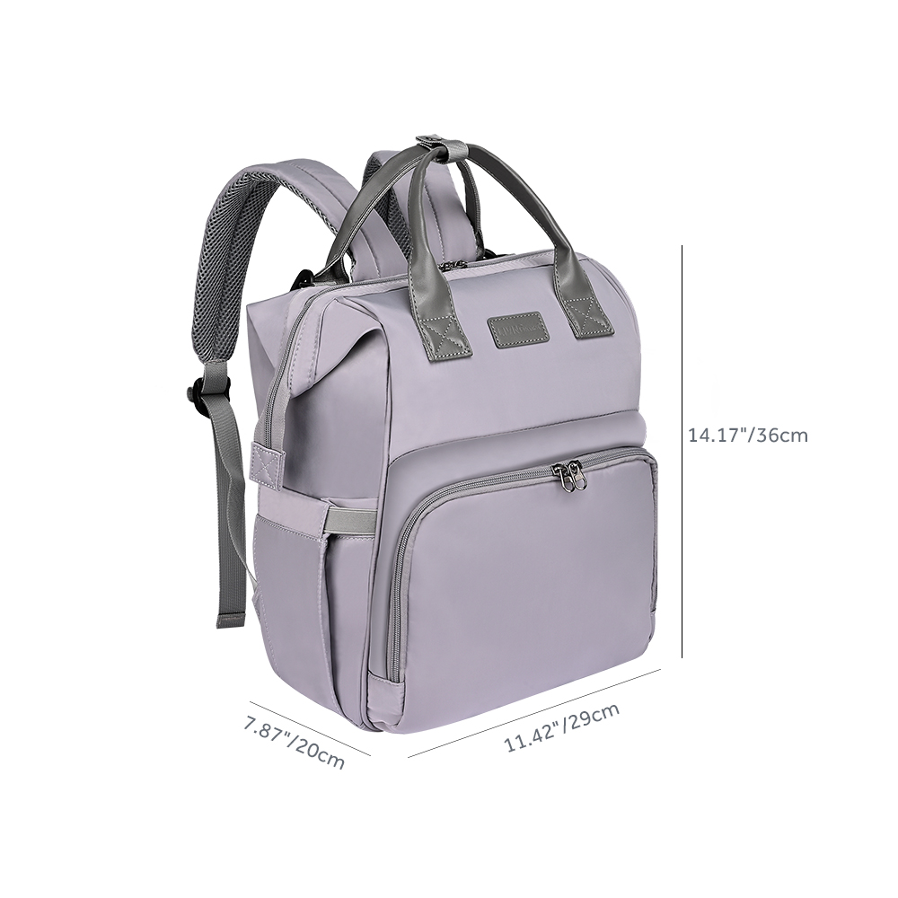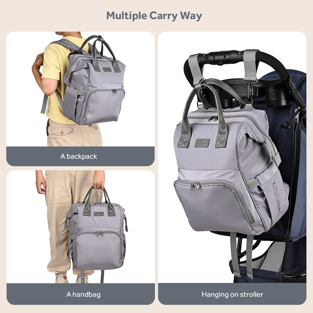 The backpack is designed with wide cushioned shoulder straps to spread stress from shoulders while you are in a long trip, and it also equipped with a handle for lifting. The stroller strap could fix the bag on the trolley, free your hand and no more exhausted with heavy bag.