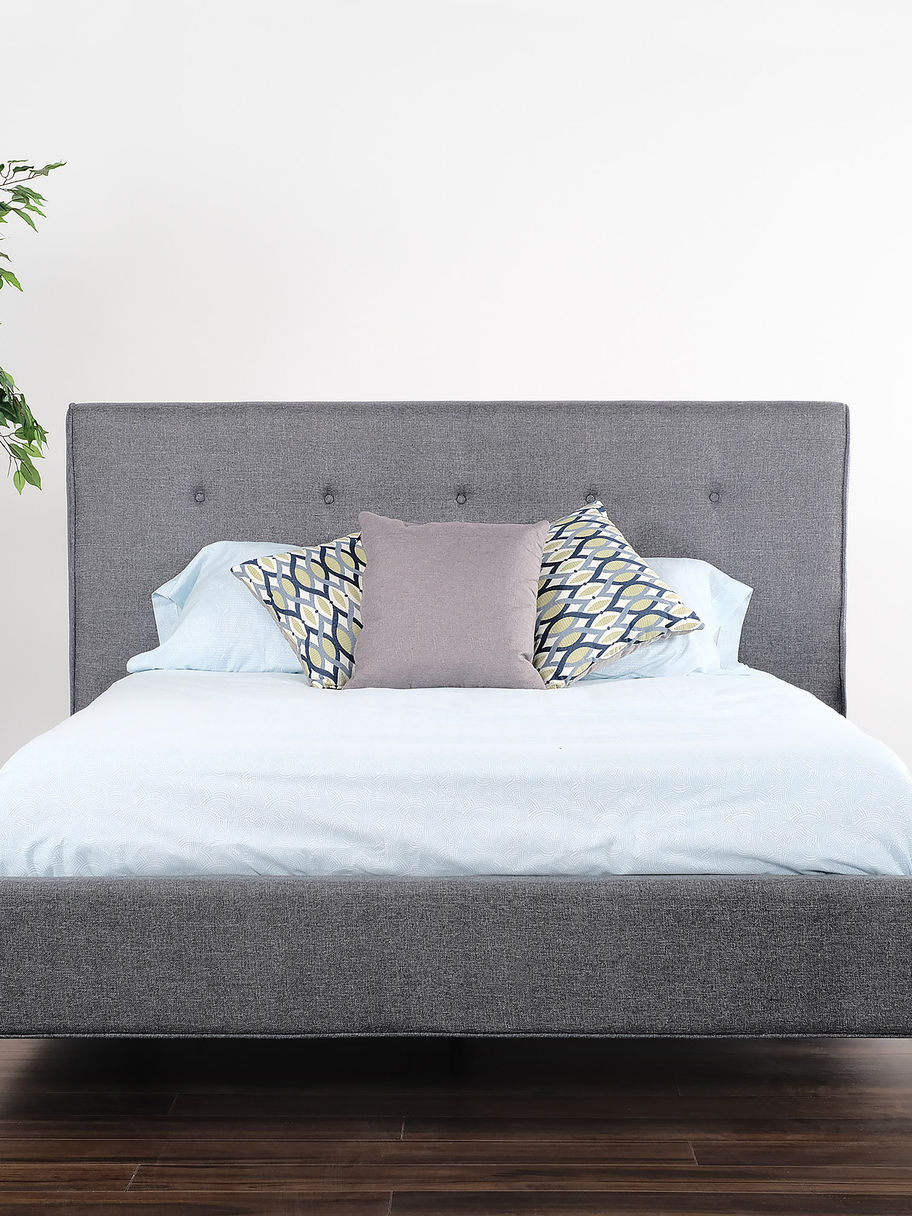 Add comfort and elegance to your favorite bedroom setting with the Whitley upholstered bed. Its slanted round feet come in a soft pine finish bringing out the slate grey linen fabric beautifully. The Whitley bed features both a stylish and comfortable headboard with button tufted accents and a lightly padded backing. This bed features a slate grey linen piping as well as curved edges giving both soft and safe corners with added detail and style. Pair the Whitley upholstered bed with some of your preferred blankets and decorative pillows for a lively look and feel.